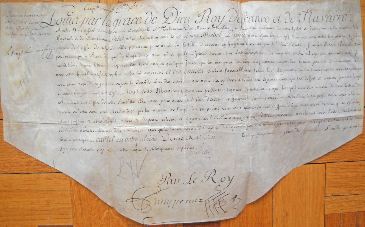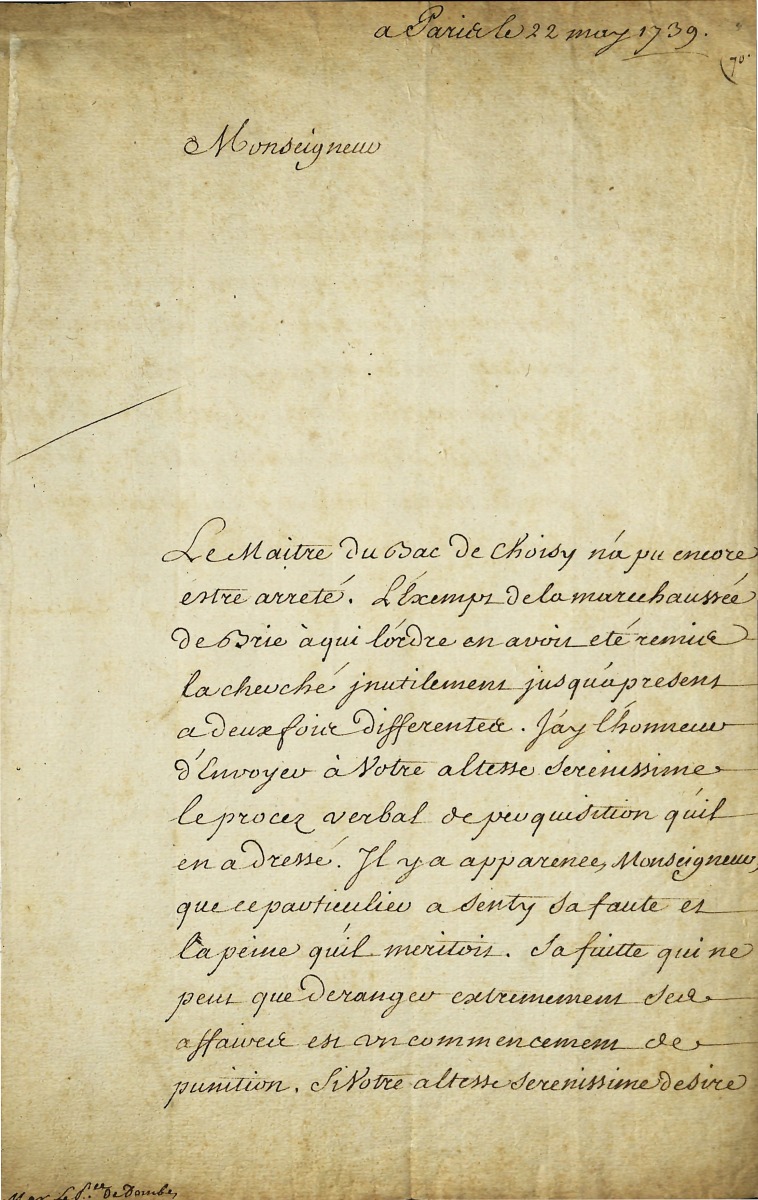 P.S. " Louis ", Marly, 30 août 1738, et contresignée par Jean-Frédéric PHELYPEAUX, comte de Maurepas, secrétaire d'Etat de la Maison du roi, 1 page obl. vélin in-plano ; lettres patentes du roi accordées à Henri Hyacinthe DALBERT pour l'office de président honoraire en la cour des comptes et aydes à Aix-en-Provence. (pliures, manques au coin droit) - L.S. par Louis-Auguste Achille de HARLAY (1679-1739), intendant de la généralité de Paris, Paris, 22 mai 1739, adressée à Louis-Auguste de Bourbon, prince de Dombes, 2 pages in-fol. ; au sujet de l'arrestation du maître du bac de Choisy - P.S. " Louis ", Versailles, 19 janvier 1742, et contresignée par Jean-Frédéric PHELYPEAUX, comte de Maurepas, secrétaire d'Etat de la Maison du roi, 1 page obl. vélin in-fol. ; dispense d'âge accordée à Robert Elie Davy, avocat en parlement, pour remplir les fonctions de magistrat en la sénéchaussée et siège présidial d'Angers [poursuivra sa carrière à Saint Domingue]. (pliures, manques qui n'altèrent pas le texte) - L.S. par Louis Auguste de BOURBON (1700-1755), petit-fils de Louis XIV et gouverneur de la province du Languedoc, Versailles, 5 décembre 1745, 1 page in-fol. ; convocation adressée à la communauté des habitants d'Uzès pour la réunion des Etats généraux du Languedoc prévue le 20 janvier 1746 à Montpellier. - P.S. " Louis ", Versailles, 25 septembre 1771, et contresignée par Louis PHELYPEAUX de Saint Florentin, secrétaire d'Etat de la Maison du roi, 1 page obl. vélin in-fol. ; dispense d'âge accordée à Michel Dumes pour obtenir la charge de procureur du roi en la ville d'Avesnes en Hainault et Cambraisis [Pas de Calais]. (pliures, manques qui n'altèrent pas le texte)