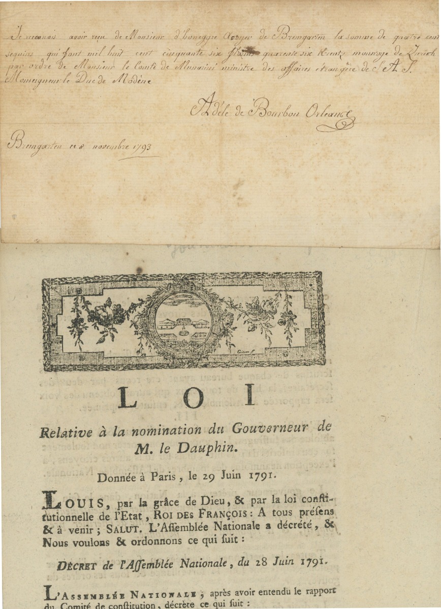 P.S. " Louis ", Versailles, 1er septembre 1779, et contresignée par le prince de MONTBAREY, secrétaire d'état à la guerre, 1 page obl. vélin in-folio ; brevet de pension accordé à Joseph Gilles François de la MOUSSAYE (1724-1794), chevalier de Saint Louis, capitaine au régiment de Provence-Infanterie. - Pièce imprimée " Loi relative à la nomination du gouverneur de M. le Dauphin ", Paris, 29 juin 1791, 3 pages in-4 (dernière page raccourcie sans altérer le texte) - P.A.S. par Adèle de Bourbon d'Orléans, ou Madame Adélaïde, fille de Philippe-Egalité, sur cadette de Louis-Philippe, datée du 8 novembre 1793 à Bremgarten [au couvent Sainte-Claire, en Suisse], ½ page in-4 ; Billet de quittance établi lors de son exil en Suisse au couvent Sainte-Claire de Bremgarten.