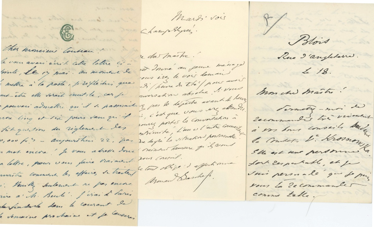 Joint: 3 L.A.S. 1868, 1877 et s.d., d'Armand Baschet (1829-1886), écrivain, journaliste et polémiste blésois, adressées à Émile COUTEAU, avocat à Blois.