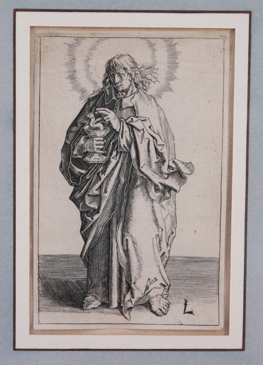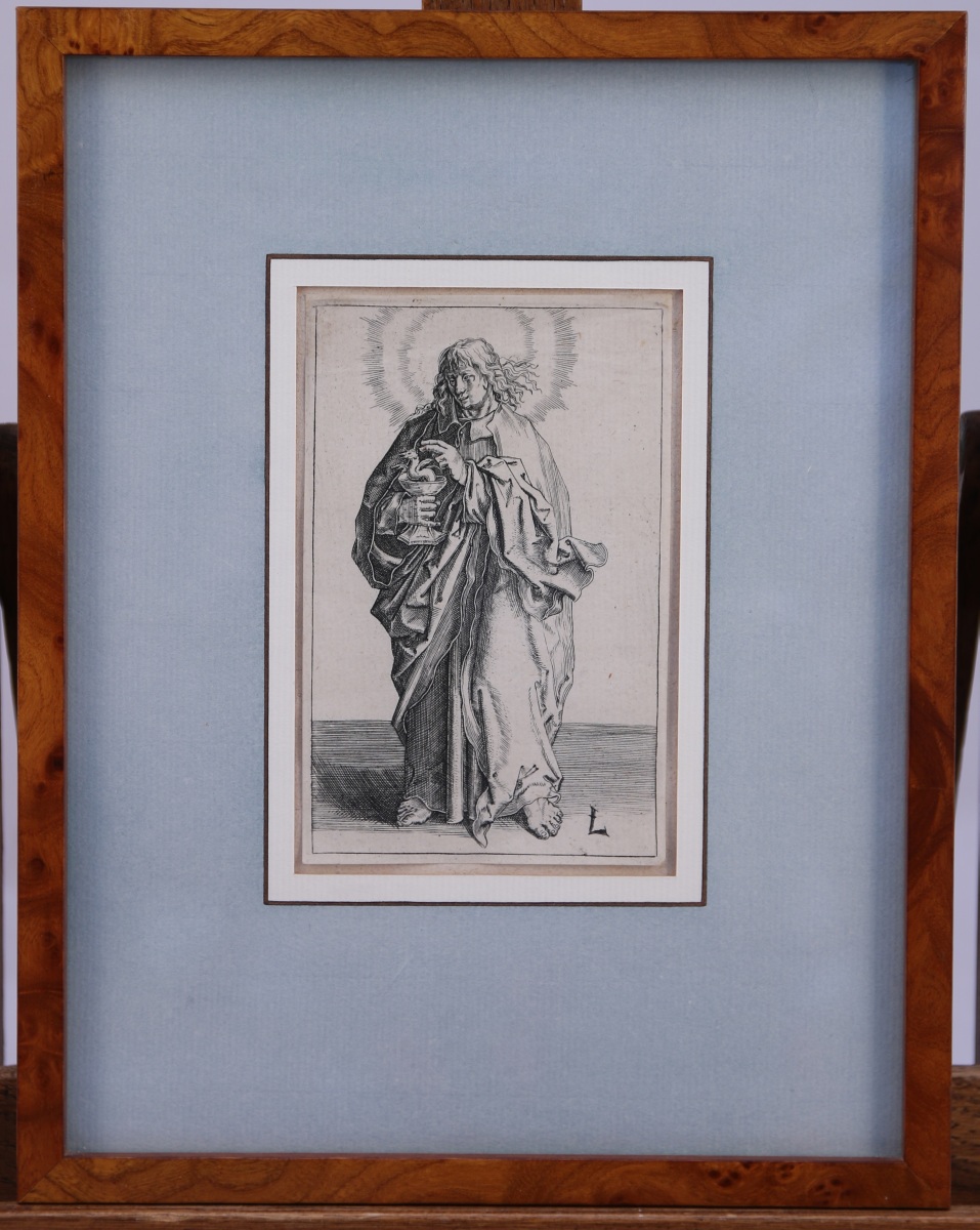 - Lucas DE LEYDE (1494 - 1533). Saint Jean. Gravure issue de la série «Le Christ, saint Paul et les douze Apôtres» monogrammée en bas à droite. 11,8 x 7,5 cm.