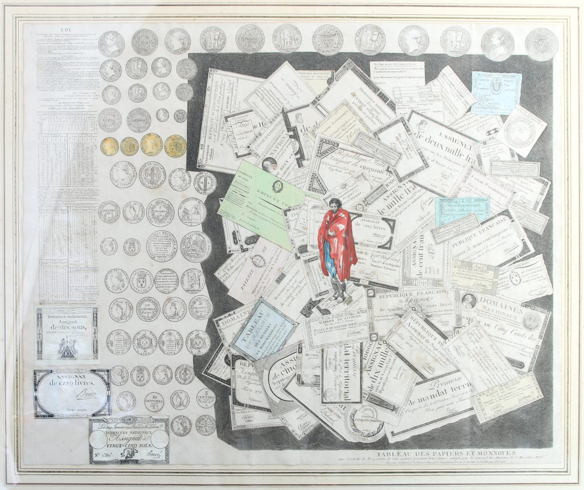 "TABLEAU DES PAPIERS ET MONNOYES / Avec L'echelle de Proportion de leur valeur pendant leurs cours adopté par le conseil des Anciens le 5 Messidor An V. / Dessiné et Ecrit à la Plume d'après les Originaux Par A.A Lejeune et Réduit par Tassart."