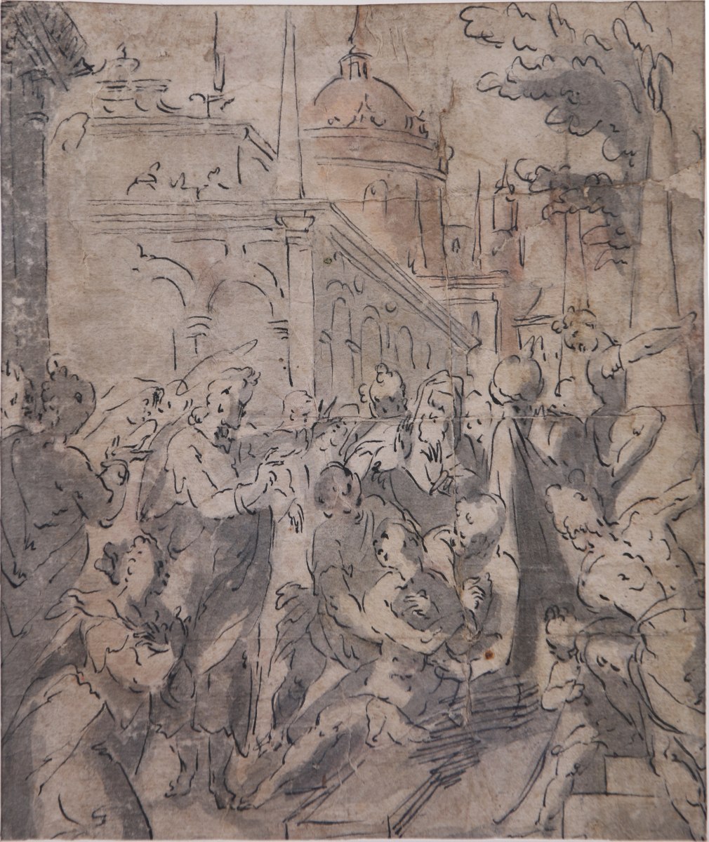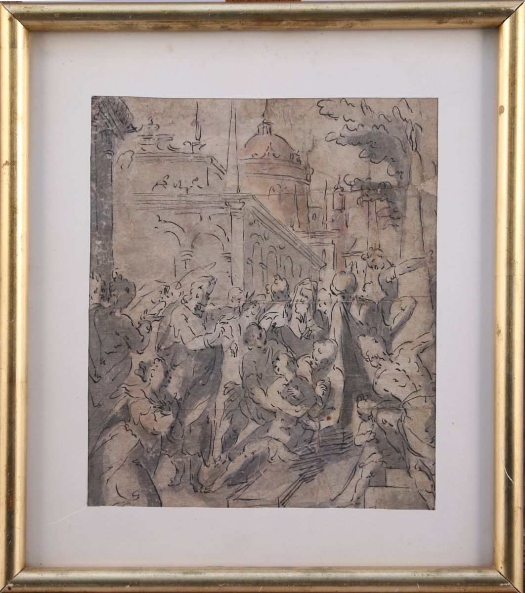 Plume et encre noire, lavis gris, lavis de sanguine.