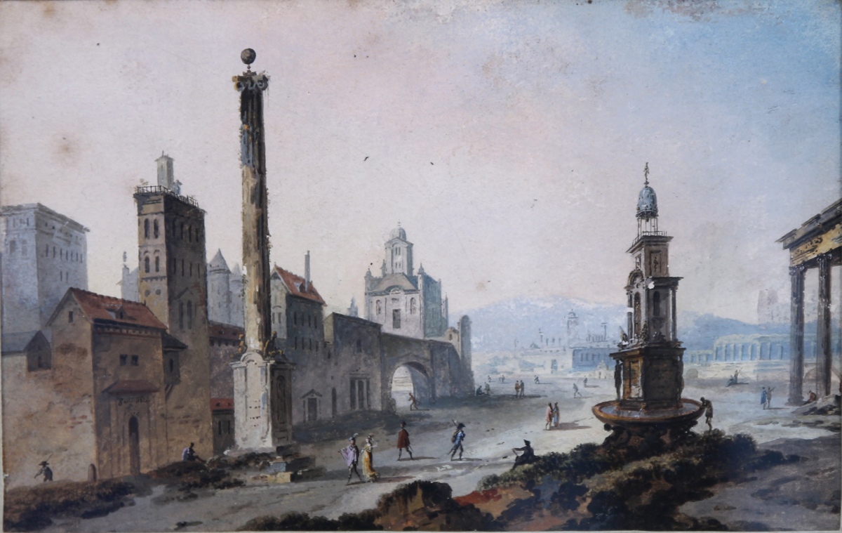 Ruines antiques, faubourg animé.