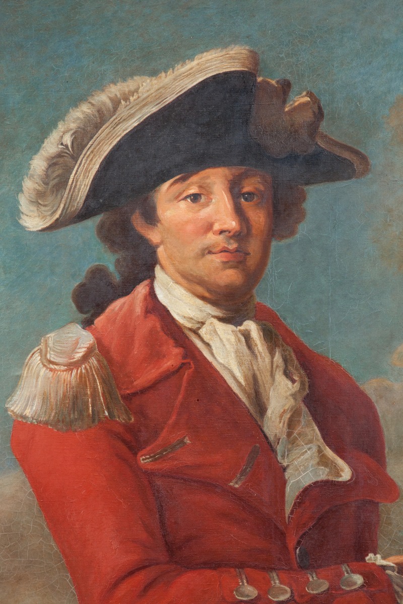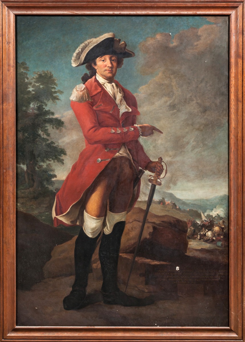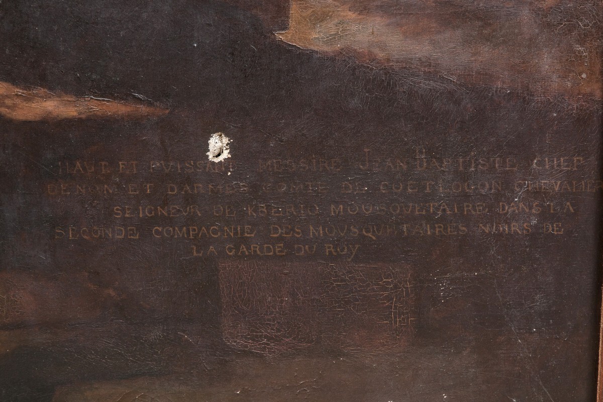 Toile annotée "Haut et puissant messire Jean Baptiste chef / de nom et darmes comte de Coetlogon chevalier / seigneur de Kberio mousquetaire dans la / seconde compagnie des mousquetaires noirs / de la garde du Roy".