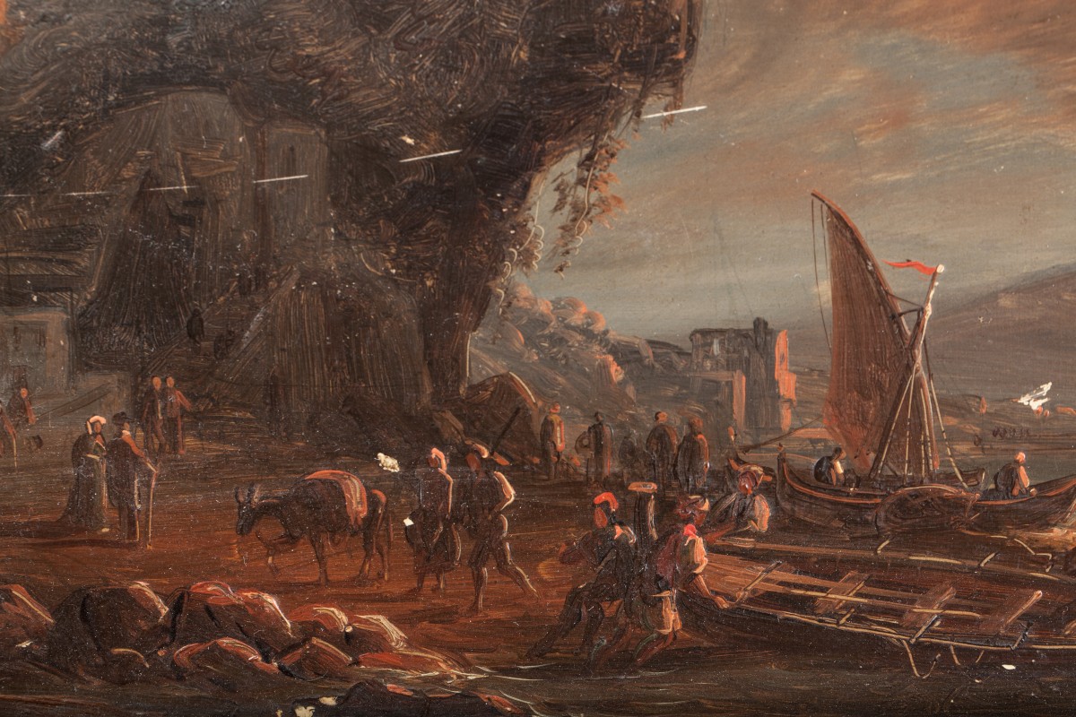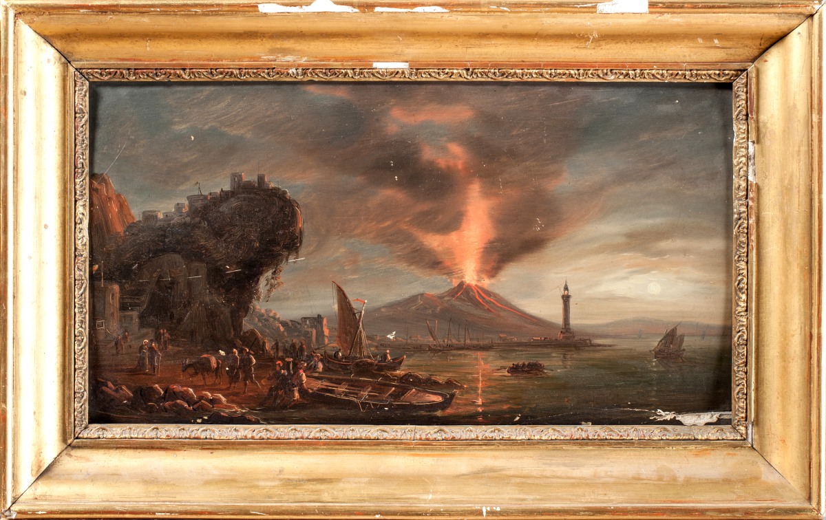 Notre tableau montre la fascination des artistes autour de Pierre Jacques Volaire, Saverio Della Gatta face au spectacle du volcan. La vision nocturne permet d'en accentuer les pouvoirs expressifs et s'inscrit dans l'esthétique nouvelle du sublime. Le traitement du rocher sur la gauche, de ses constructions, de la végétation, comme le pittoresque de la scène avec ses embarcations caractérisent le paysage romantique.
