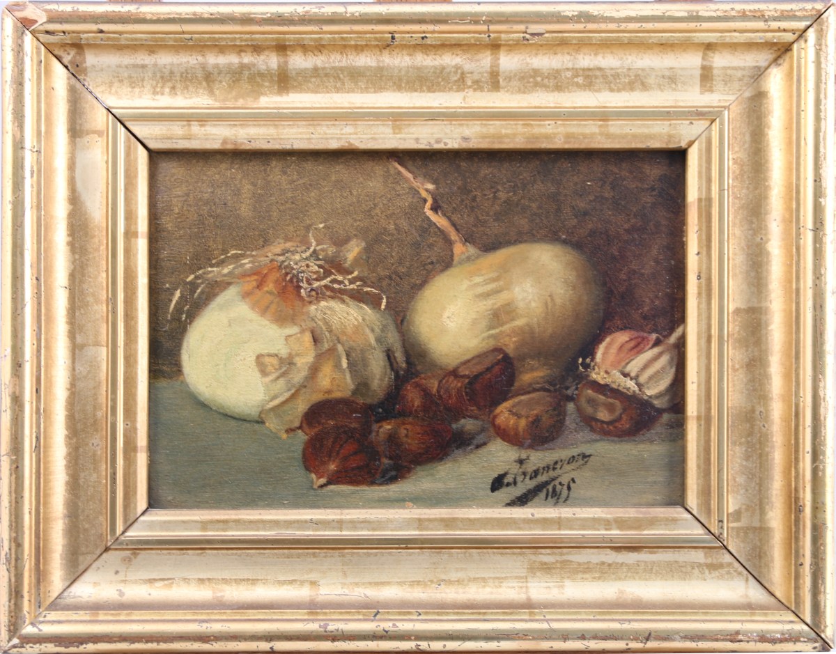 Nature morte aux oignons, chataignes et ail.