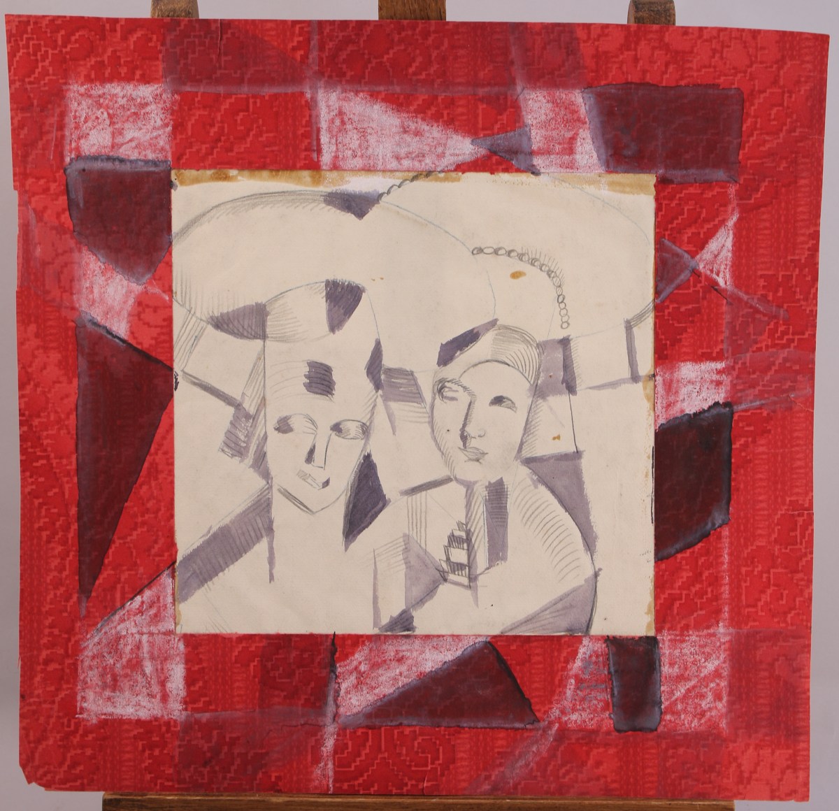 - Deux femmes. Crayon et aquarelle. Encadrement géométrisant sur papier imprimé. 39 x 40,5 cm.