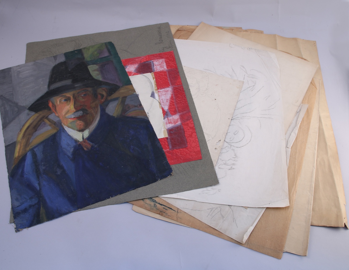 - 11 autres oeuvres: portrait d'homme, fusain; homme et femme, fusain et pastel; homme et femme de profil devant un paysage, mine de plomb et pastels; étude de visages sur papier calque; dame et ses chats, mine de plomb et fusain; étude de danseuses, fusain; 3 études de religieuse; dame et berger allemand, mine de plomb; dame prenant une collation, mine de plomb; paysanne au fagot, fusain.