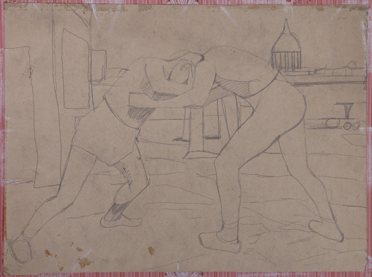 - Les Lutteurs. Mine de plomb. Dessin préparatoire au tapis réalisé en 1924 par la manufacture d'Aubusson. 24,5 x 33 cm.