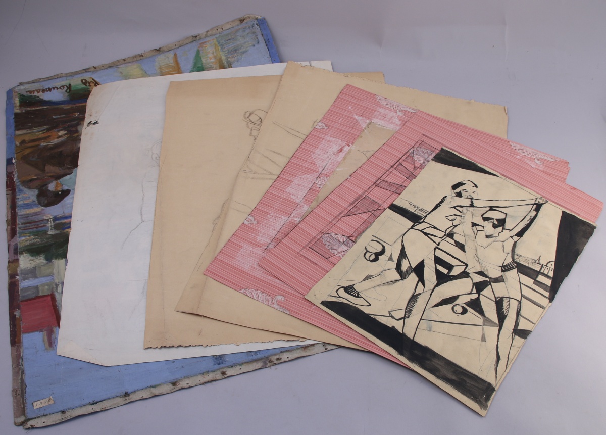 - 5 autres oeuvres: les lutteurs, crayon et encre; les boxeurs, crayon et encre; rameuse, fusain (joueuse de tennis au verso); le gardien de but (?), fusain (vache au verso) et un probable dessin préparatoire au "Bicycliste", 1924 (joueur de tennis au verso).