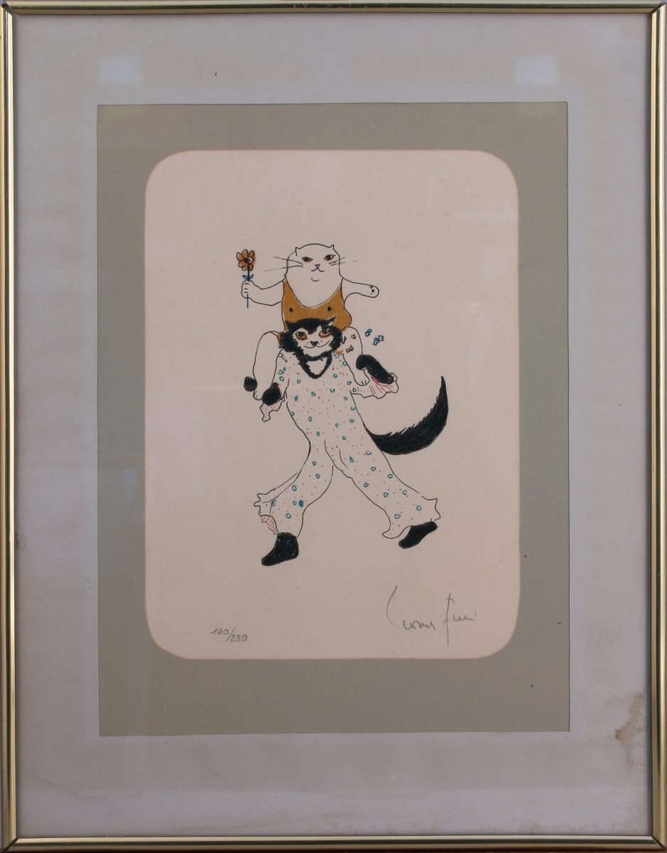 Gravure réhaussée en couleur, signée en bas à droite et numérotée 140/230 en bas à gauche.