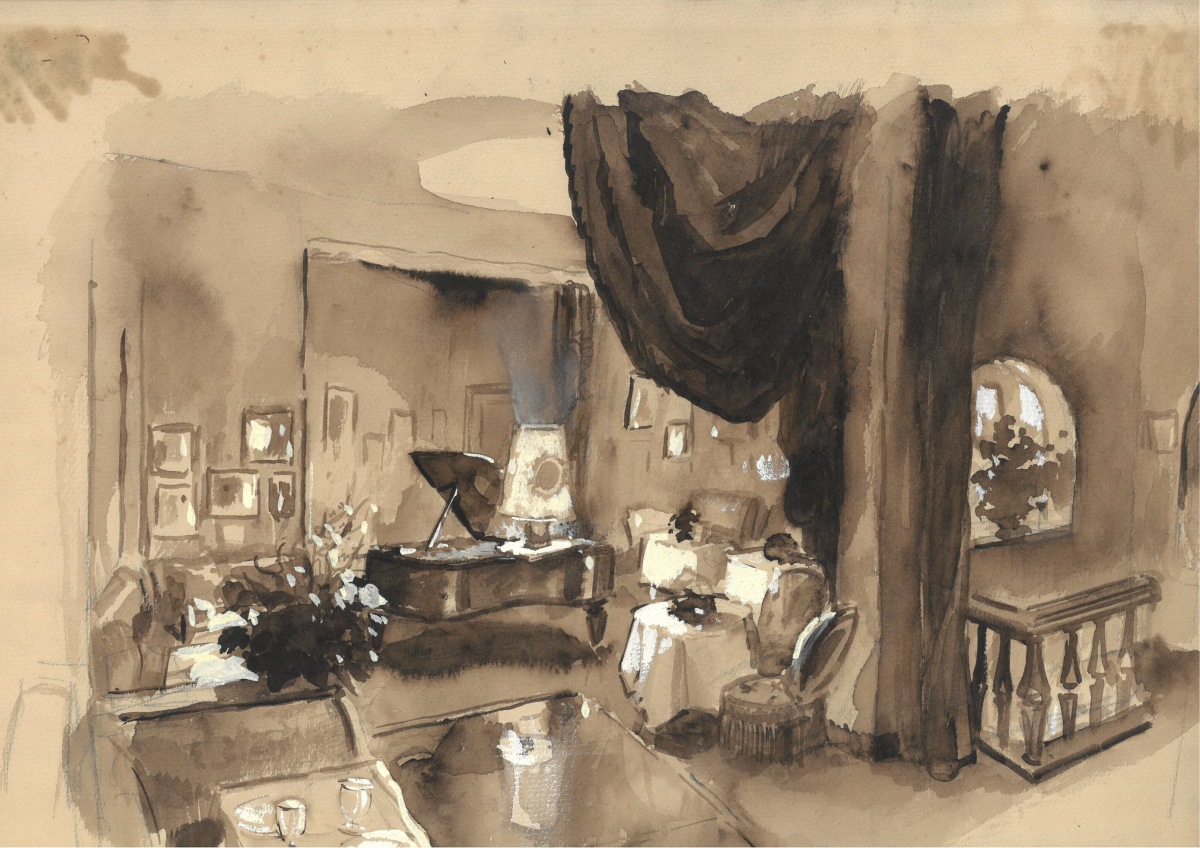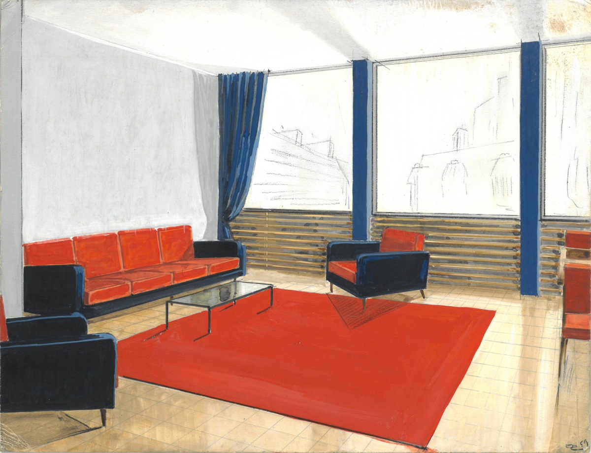 PROJETS DE DÉCOR. Ensemble comportant une cinquantaine de DOCUMENTS GRAPHIQUES: croquis, gouaches, aquarelles - projets de décors de films, de théatre, de restaurant, décors intérieurs...
