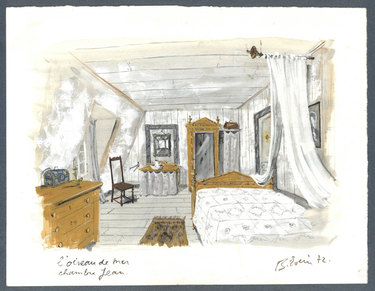 5 projets de décor pour "l'Oiseau de mer": "Chambre Jean, Presbytère chambre recteur, Couloir Délia chateau, Chambre Délia, Labo photo".