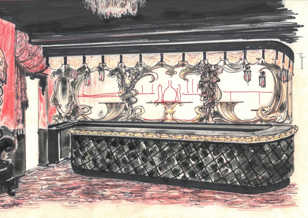 6 projets de décor pour "La poële d'or rue Miromesnil", "La cheminéé Marignan", "La cave", "Chambre labo Hotel Beaurivage", "Le couloir Hotel Beaurivage".
