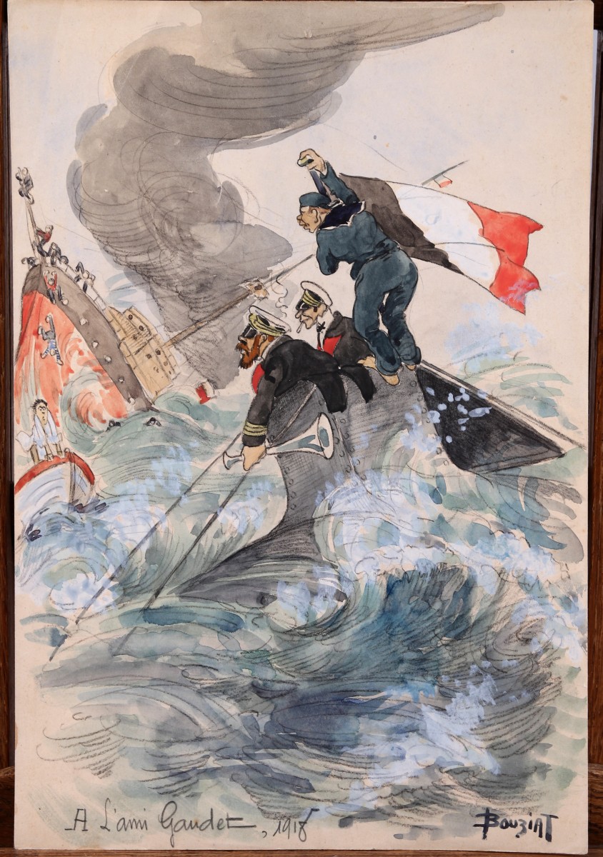 MARINE. 2 DESSINS, dont BOUZIAT: Navire sombrant et sous-mariniers. Aquarelle humoristique signée et datée 1918. 31 x 21 cm.