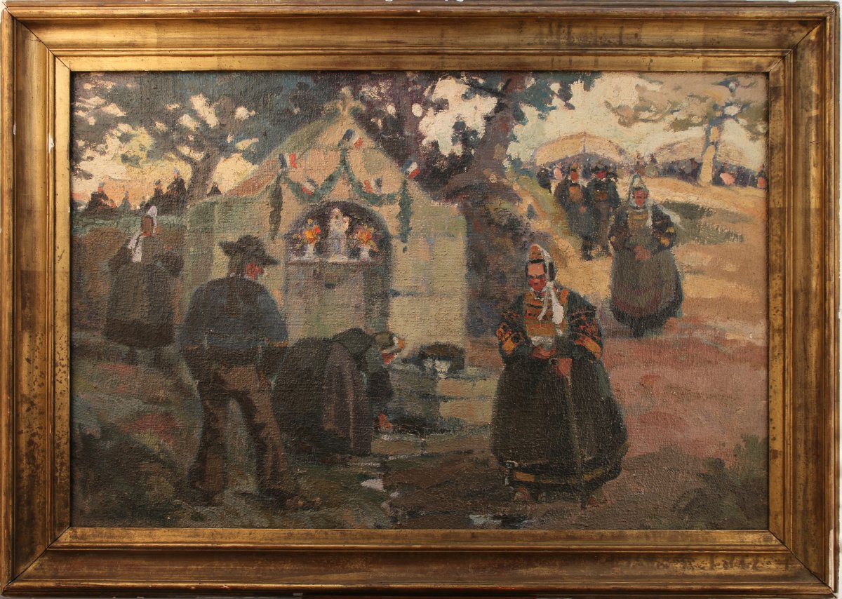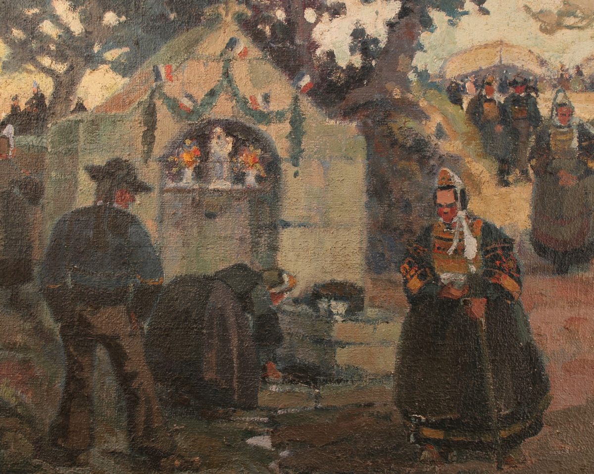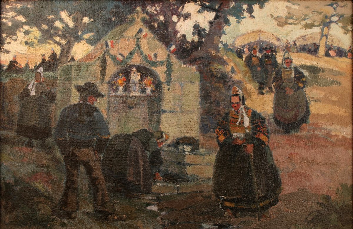 La fontaine miraculeuse de la chapelle de la Clarté à Combrit, en pays Bigouden, est célèbre pour son pardon des aveugles. Une toile d'Henri Guiner la représentant est d'ailleurs conservée au musée départemental breton de Quimper. Peintre de la marine de 1942 jusqu'à la fin de sa vie, Marcel-Laurent est le chantre de la Bretagne, de ses paysages et de ses traditions. Il livre ici un pardon lumineux, sur une grande toile agrémentée de drapeaux patriotiques tricolores.
