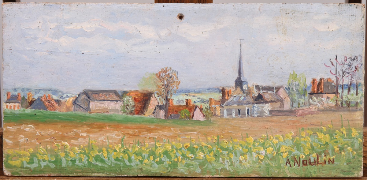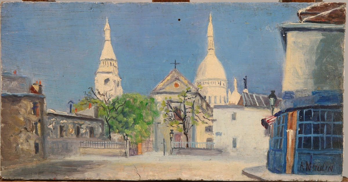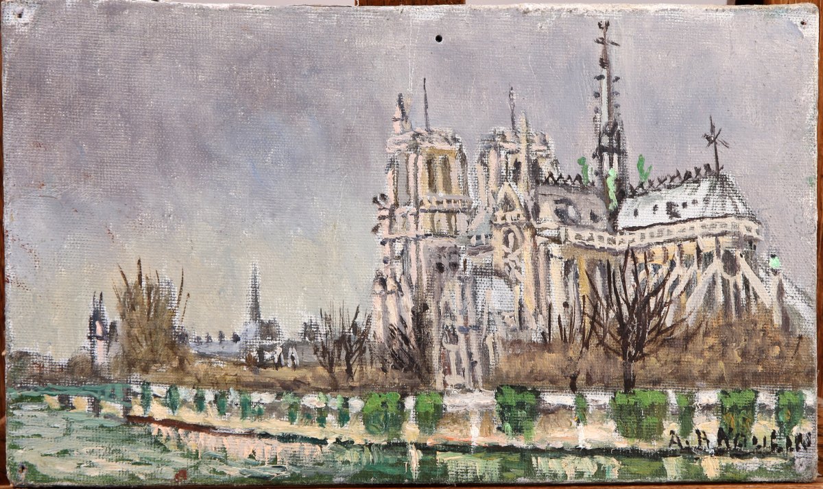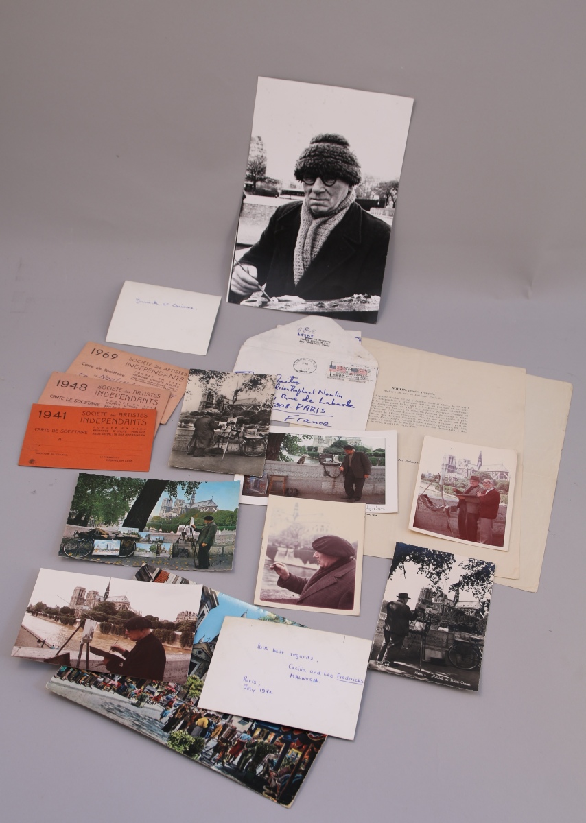 Joint dossier sur Noulin: biographie de 1937, cartes société des artistes indépendants 1941, 1948, 1969. Photographies et cartes postales le représentant peindre au chevet de Notre Dame. Lettre admirateur américain