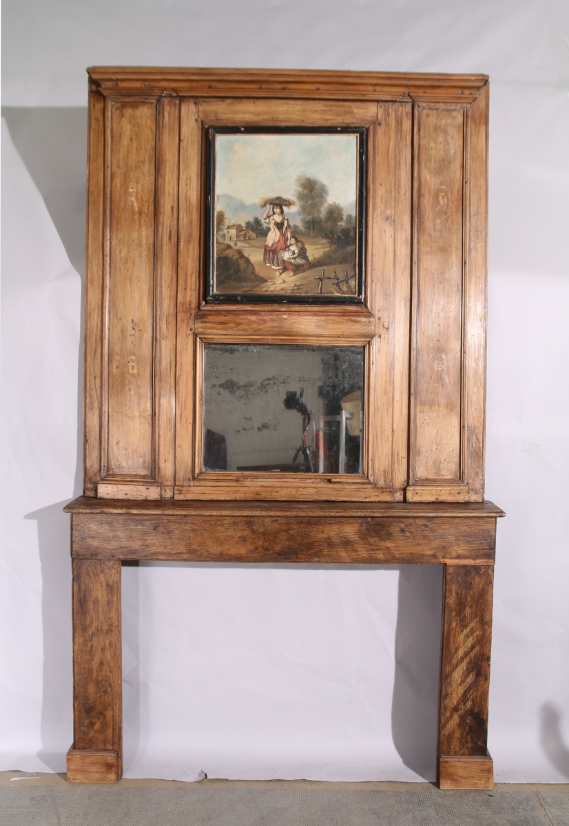 ENCADREMENT DE CHEMINÉE ET TRUMEAU de forme rectangulaire en bois naturel mouluré et sculpté. Le trumeau est agrémenté d'un miroir en partie basse et d'une toile représentant une femme et ses enfants sur fond paysagé en partie haute.