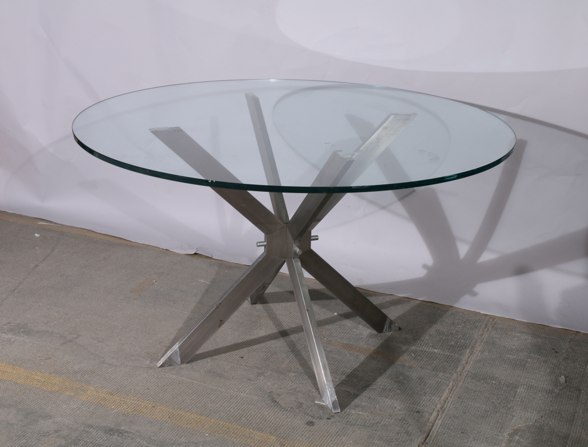 - TABLE à plateau de verre de forme circulaire reposant sur un piètement quadripode en "X" en aluminium. Haut. 72, Diam. 120 cm.