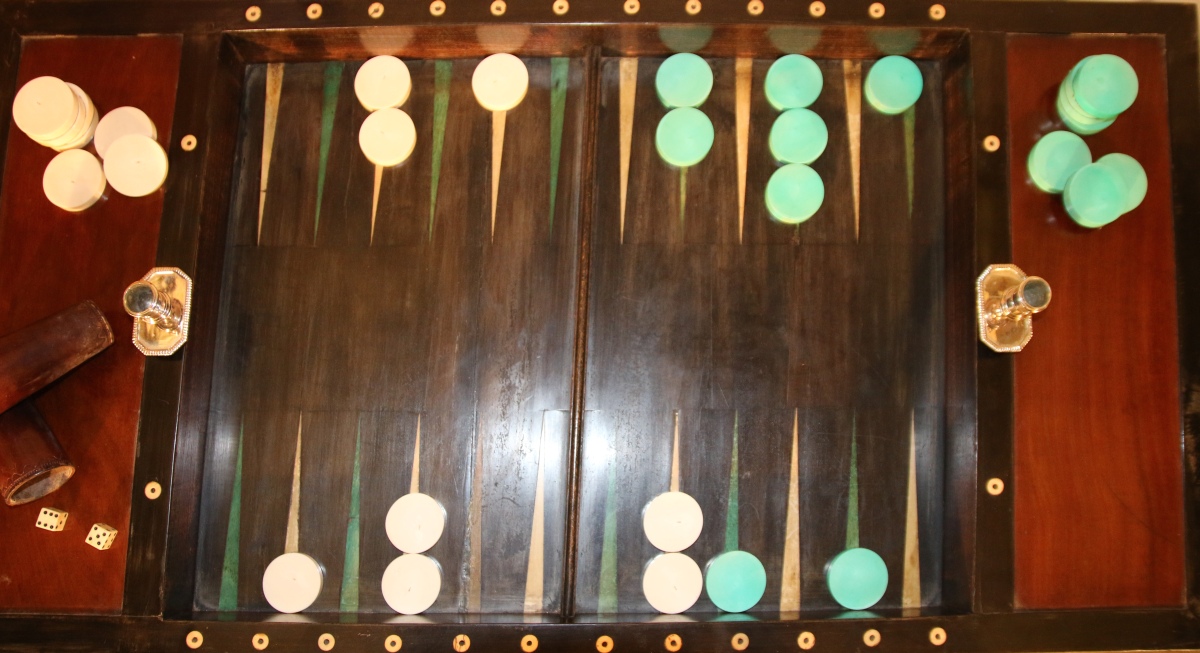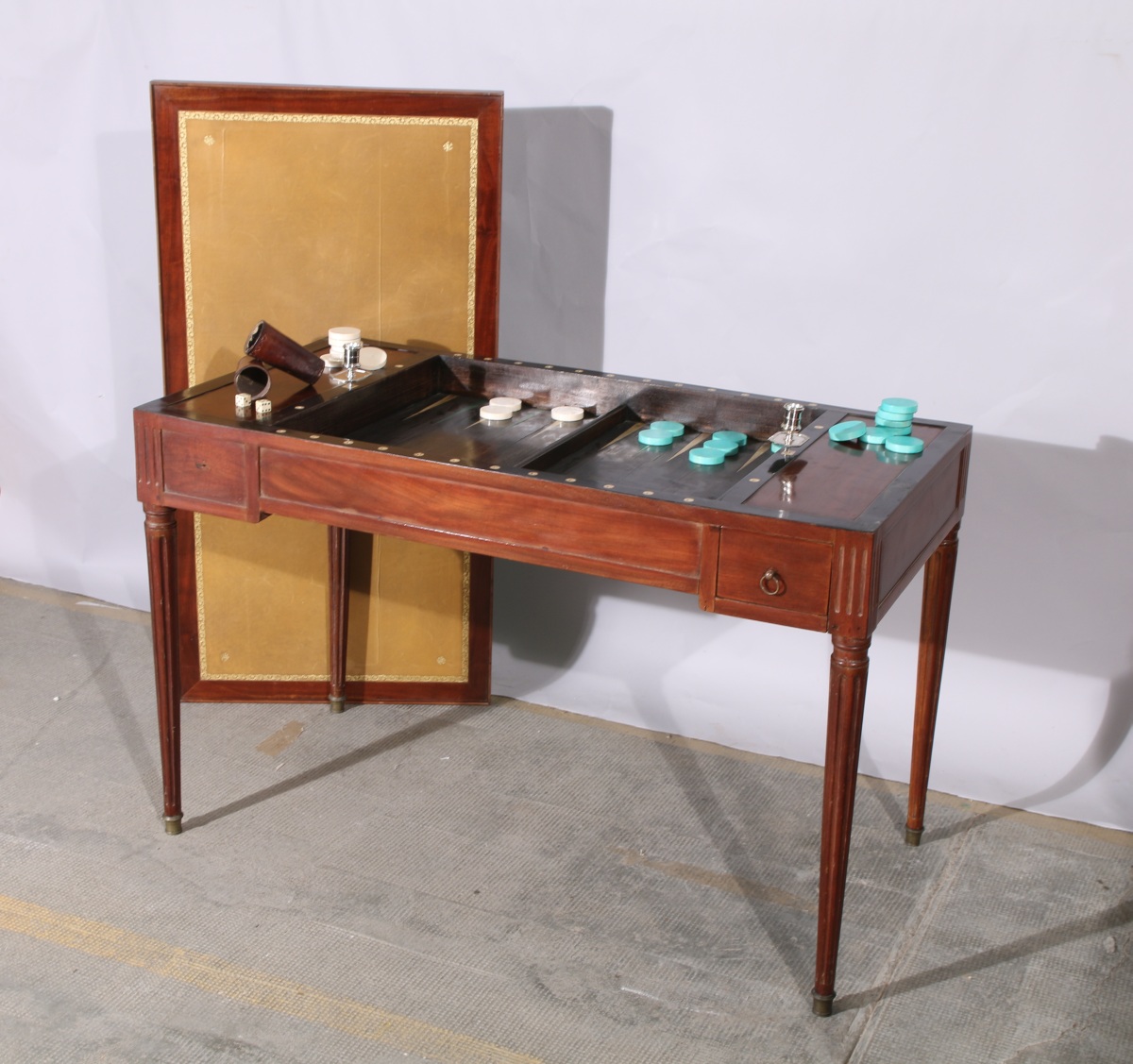 TABLE de TRIC-TRAC en acajou et placage d'acajou ouvrant par deux tiroirs. Le plateau gainé d'un cuir doré aux petits-fers pour une face et d'un feutre pour l'autre (postérieurs). Il découvre un intérieur en placage d'ébène incrusté d'os et d'os teinté vert. Il repose sur quatre pieds fuselés et cannelés terminés par des sabots de bronze.