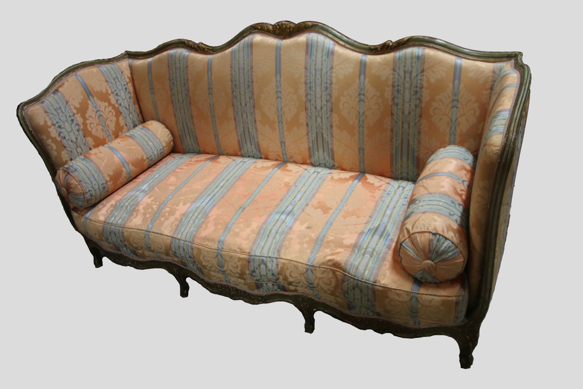 CANAPÉ en bois mouluré, sculpté de fleurettes et acanthes et rechampis vert et or. Traverses chantournées. Repose sur sept pieds à enroulement.