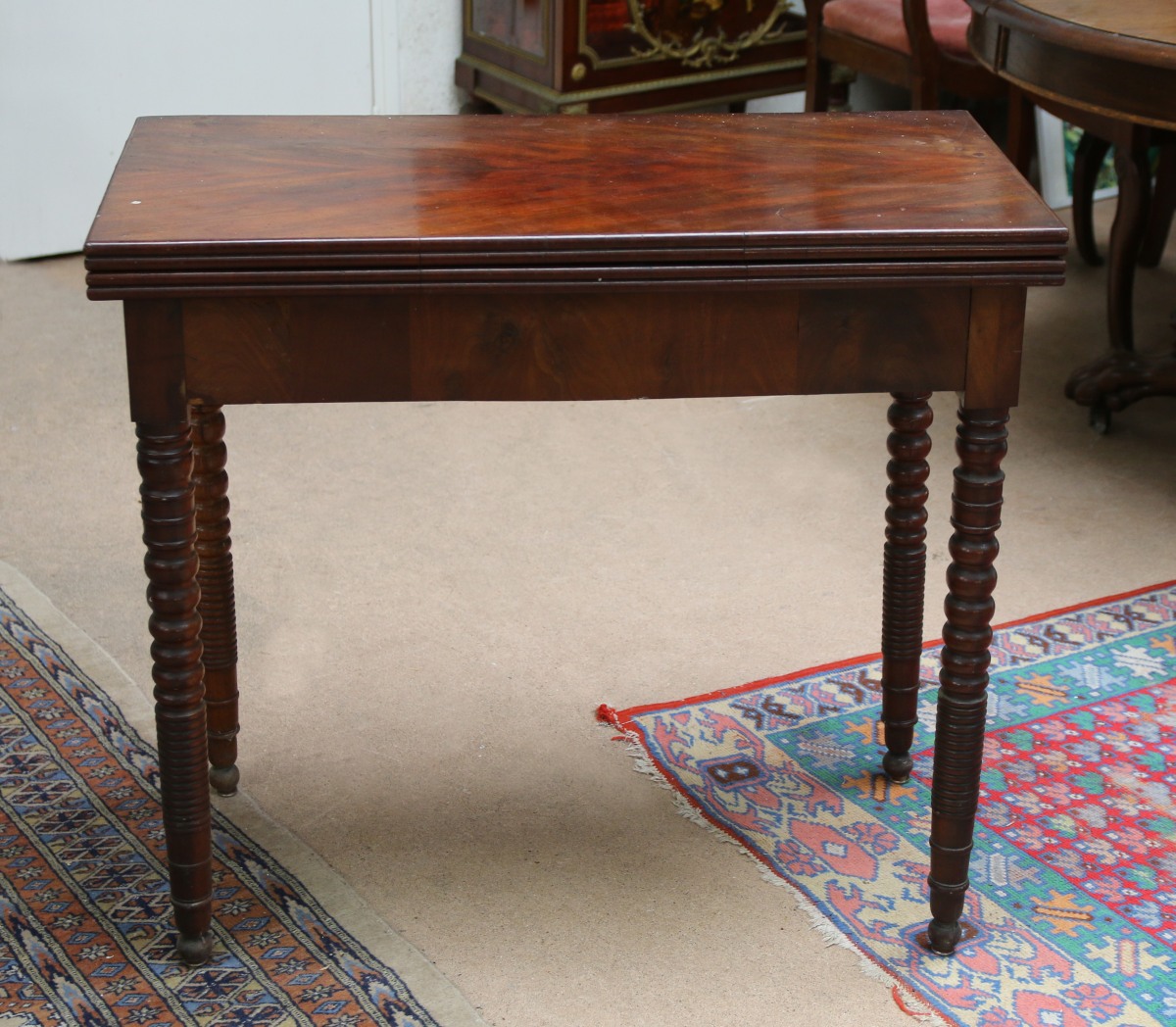 TABLE À JEU de forme rectangulaire en acajou et placage d'acajou. Elle repose sur quatre pieds tournés.