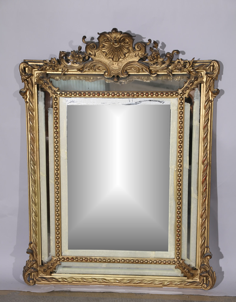 MIROIR À PARECLOSES de forme rectangulaire en bois mouluré, sculpté, stuqué et doré orné d'un répertoire de style rocaille tel que rais de perles, agrafes, rubans et perles, feuilles d'acanthes, l'amortissement supérieur orné d'une coquille et rinceaux fleuris.