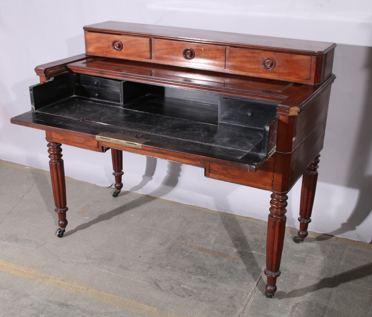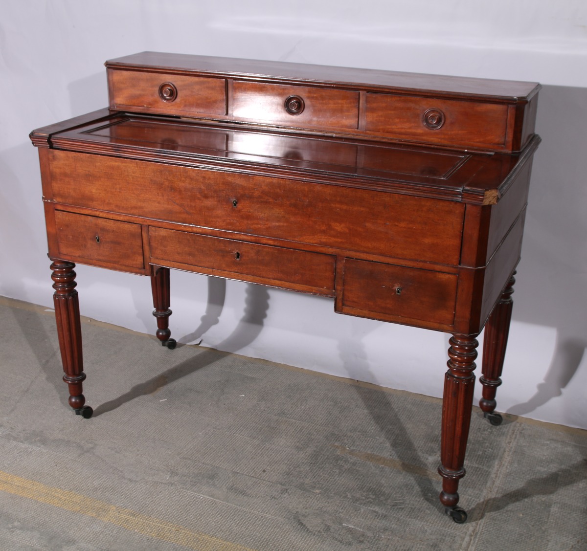 BUREAU À GRADIN de forme rectangulaire en acajou et placage d'acajou toutes faces. Il ouvre à trois tiroirs dans le gradin et trois tiroirs en façade. Un abattant formant pupitre gainé de cuir découvre un intérieur compartimenté à trois tiroirs. Le bureau repose sur quatre pieds tournés, fuselés et godronnés à roulettes.