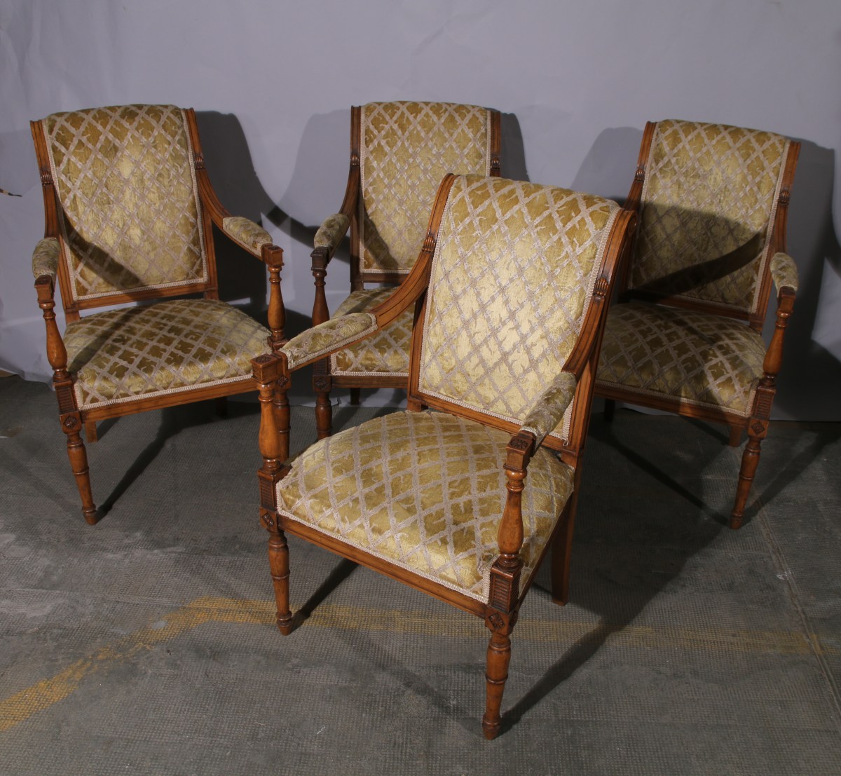 Suite de QUATRE FAUTEUILS à dossier renversé en bois clair mouluré et sculpté. Consoles d'accotoir en balustre, dés de raccordement à fleurons. Pieds antérieurs tournés, pieds postérieurs sabre.