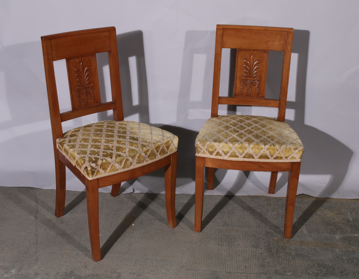 JOINT: Paire de CHAISES à dossier légèrement cintré sculpté d'une large palmette et d'une draperie.