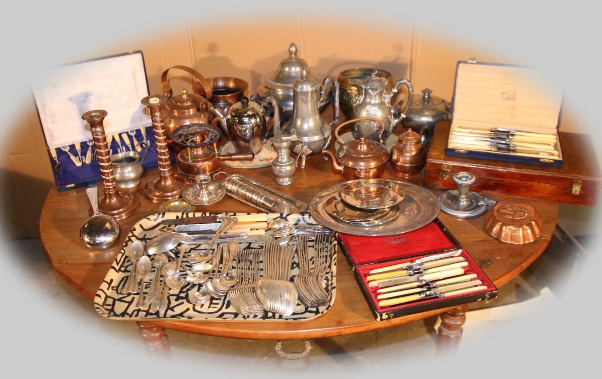 Importante RÉUNION de PIÈCES de CUIVRE, MÉTAL ARGENTÉ (dont ménagère), LAITON et ÉTAIN. À découvrir.