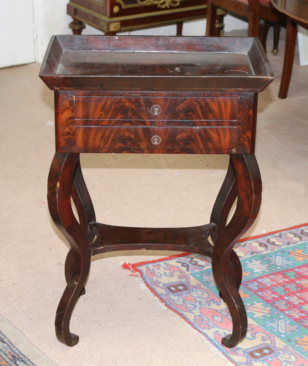 TABLE VOLANTE en acajou et placage d'acajou ouvrant par deux tiroirs en façade. Plateau cabaret de forme rectangulaire. Elle repose sur quatre pieds cambrés reunis par une tablette d'entretoise.