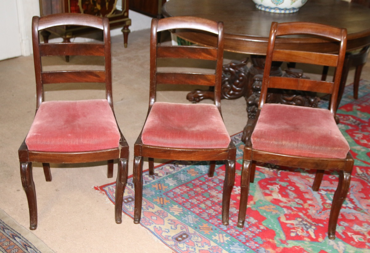 SIX CHAISES DE SALLE À MANGER à dossier légèrement renversé en bois teinté à la façon de l'acajou, pieds antérieurs en jarret, pieds postérieurs sabre comprenant: