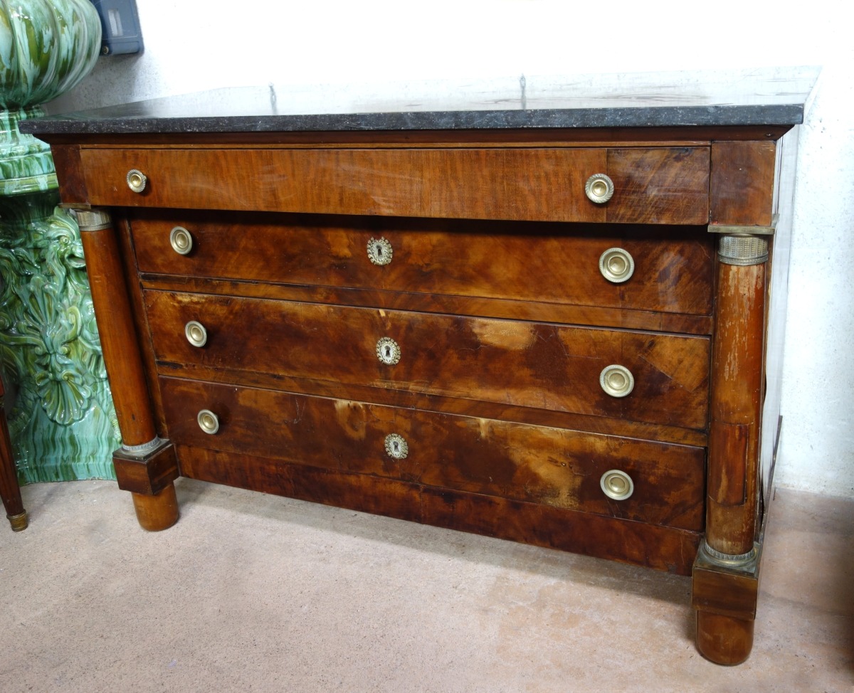 COMMODE de forme rectangulaire à colonnes détachées en acajou et placage d'acajou. Elle ouvre en façade par quatre tiroirs. Ornementation de bronzes ciselés et dorés tels que poignées de tirage, entrées de serrure, chapiteaux et bases des colonnes. Dessus de marbre gris.