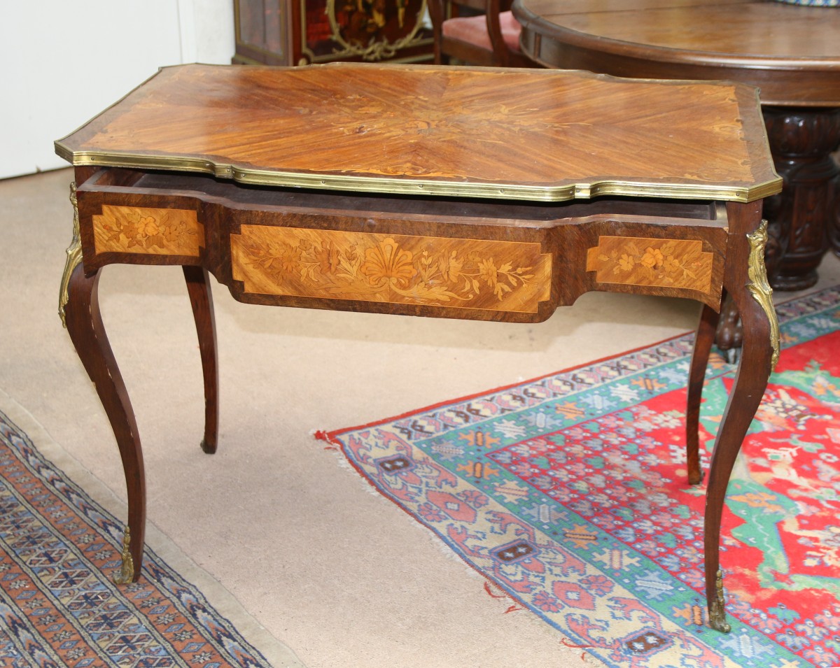 TABLE de milieu de forme rectangulaire en bois de placage et fine marqueterie florale ouvrant par un tiroir en ceinture. Elle repose sur quatre pieds cambrés. Chutes et sabots de bronze.