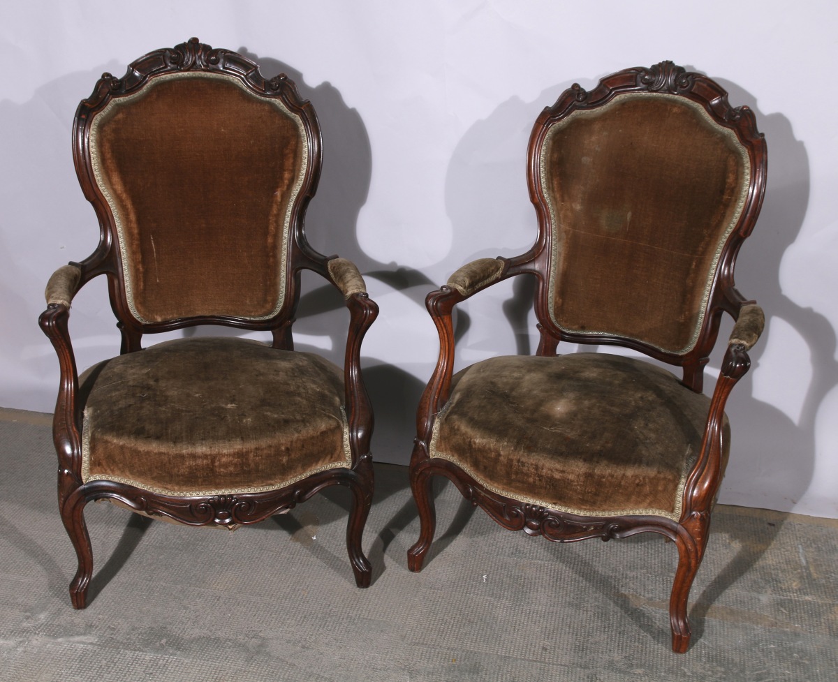 Paire de FAUTEUILS cabriolet en bois fruitier mouluré et sculpté de feuillages.