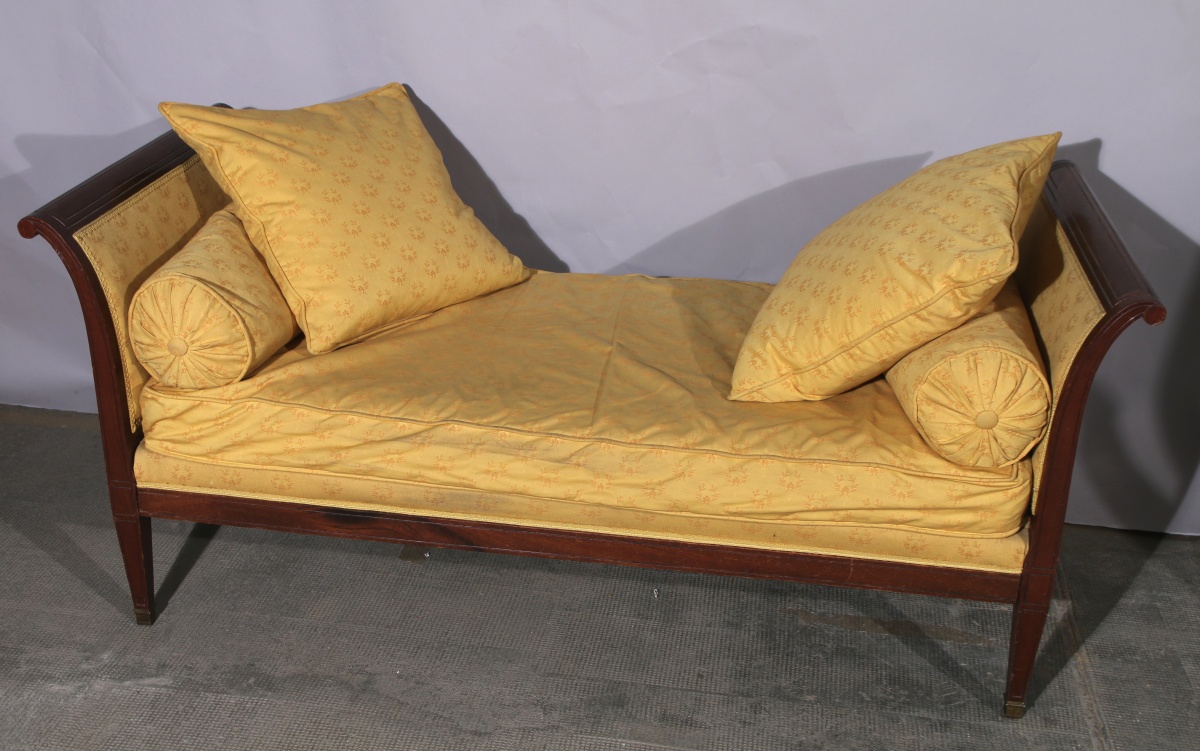 LIT DE REPOS en bois naturel. Chevets renversés. Il repose sur quatre pieds gaine à sabots de bronze.