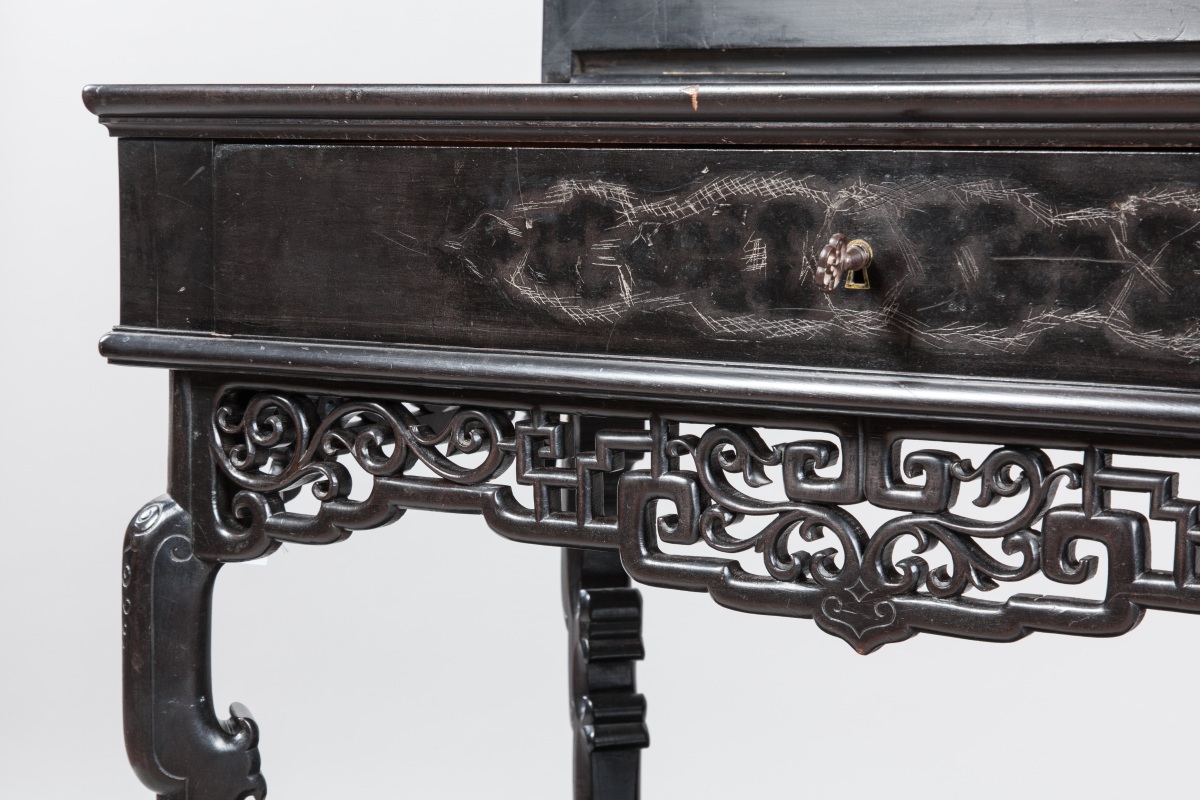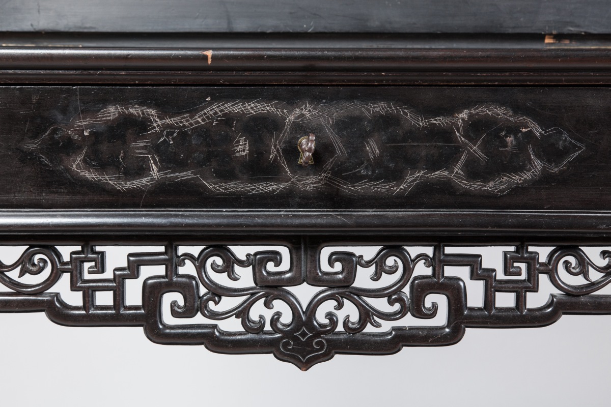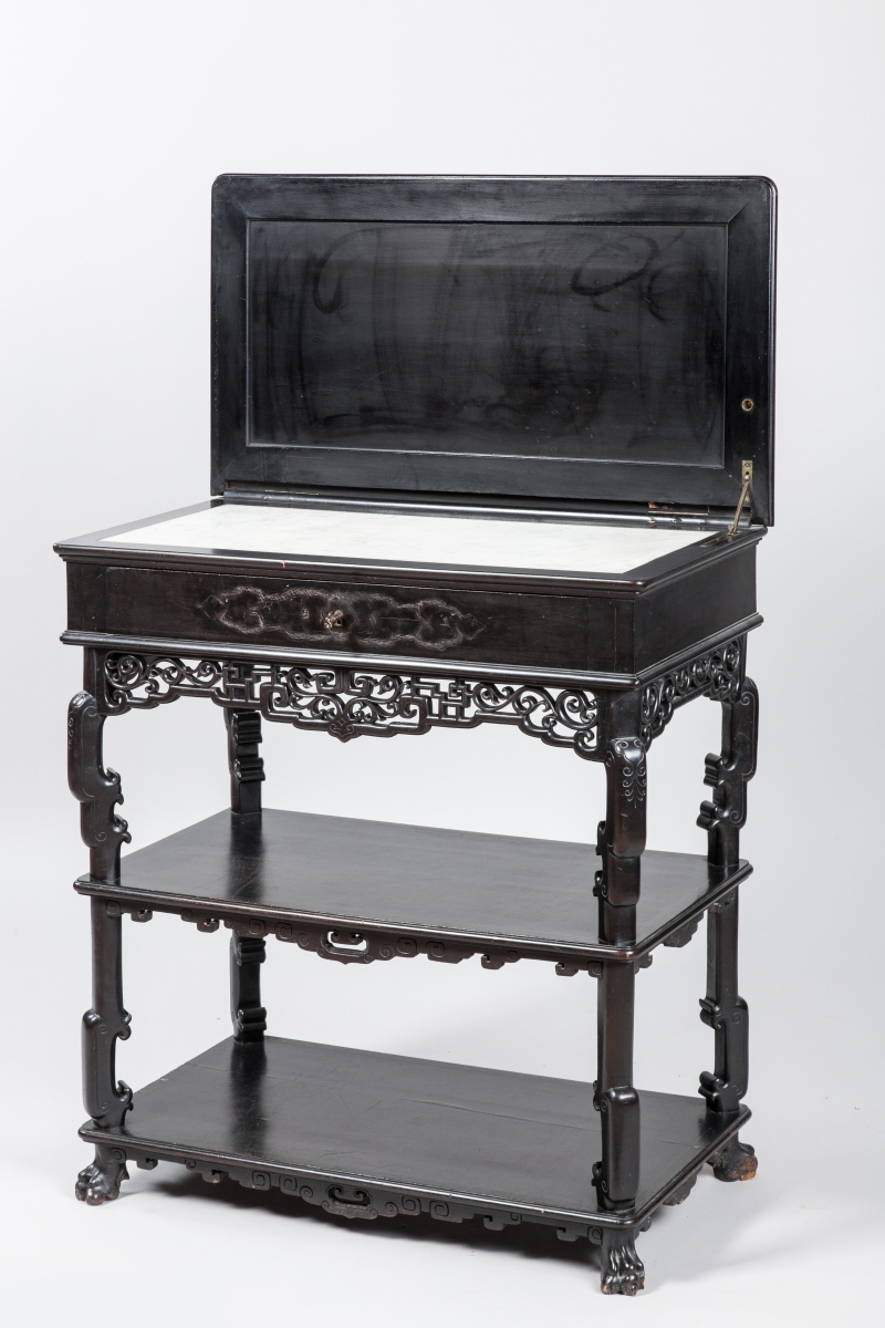 TABLE DE TOILETTE en bois noirci sculpté et gravé. Le plateau de forme rectangulaire s'ouvre pour découvrir une tablette de marbre blanc. Un tiroir en ceinture. Les montants à décor sculpté de rinceaux sont reliés par deux plateaux d'entretoise. Traverses et tablier à riche décor ajouré de filets à la grecque. Piètement quadripode en griffes de rapace.
