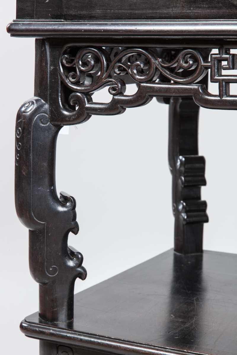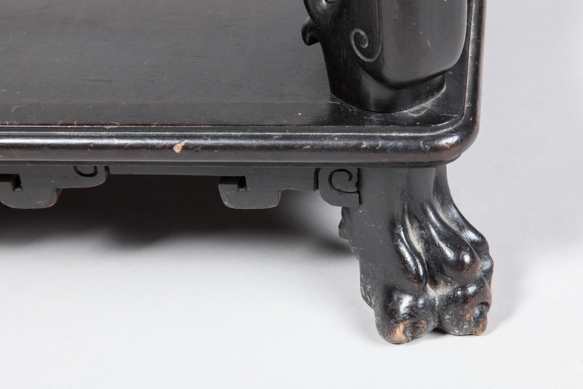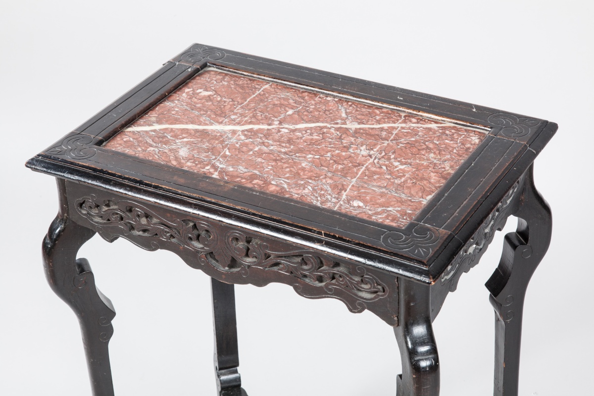 JOINT: GUÉRIDON en bois noirci sculpté et gravé. Le plateau de forme rectangulaire est orné d'un encadrement gravé et centré d'un marbre rosé. Les quatre pieds galbés à décor sculpté d'enroulements sont reliés par un plateau d'entretoise de forme chantournée ajouré de rinceaux.