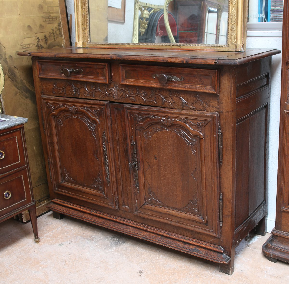 BUFFET de forme rectangulaire en chêne mouluré et sculpté. Il ouvre en façade par deux tiroirs et deux vantaux. Décor d'acanthes, rinceaux et guirlandes fleuries. Entrées de serrure et poignées de tirage en fer. Piètement quadripode.