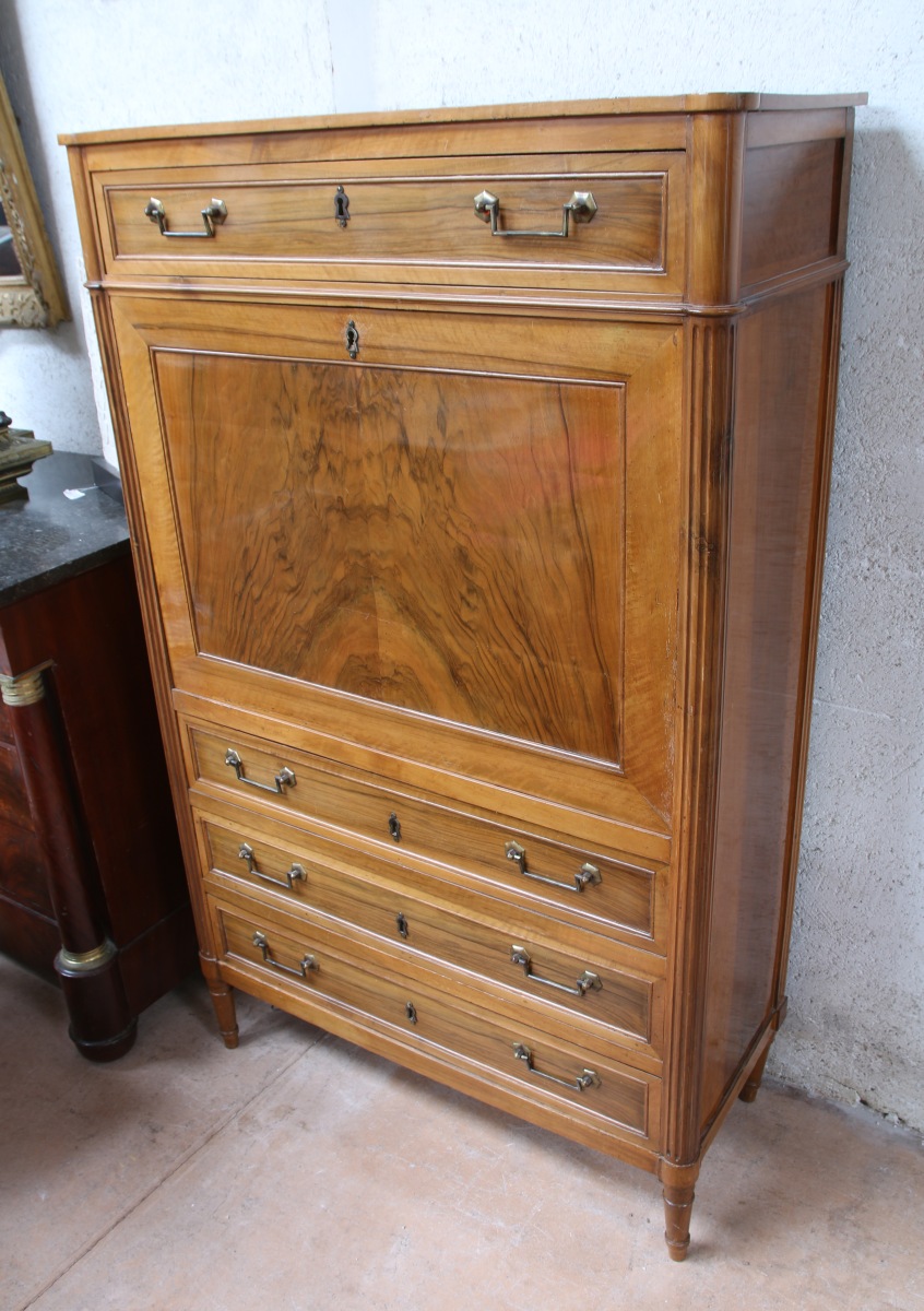 SECRÉTAIRE DROIT en noyer et placage de noyer. Il ouvre par un tiroir et un abattant en partie supérieure et trois tiroirs en partie inférieure. L'abattant foncé de cuir découvre un compartiment et cinq tiroirs sur deux rangs. Montants cannelés. Piètement quadripode. Garniture de bronzes tels qu'entrées de serrures et poignées mobiles.
