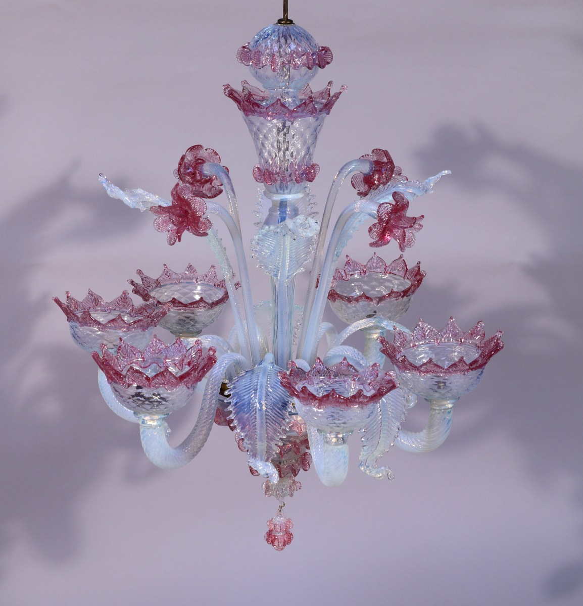 LUSTRE à six bras de lumières en verre de Venise couleur opaline savonneuse et rose. Les bobèches adoptant la forme de tournesols alternent avec des ornements feuillagés. Les ornements supérieurs figurent jonquilles et feuilles.