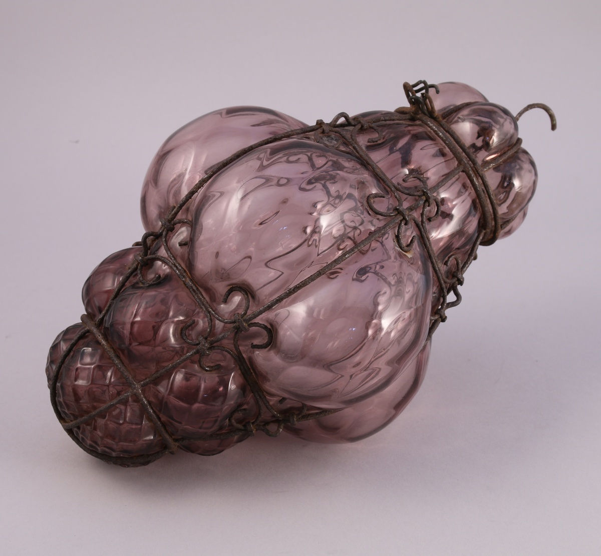 SUSPENSION de forme courge en verre de couleur mauve alvéolée s'ouvrant par un couvercle et enserrée dans une monture en fer treillagé.