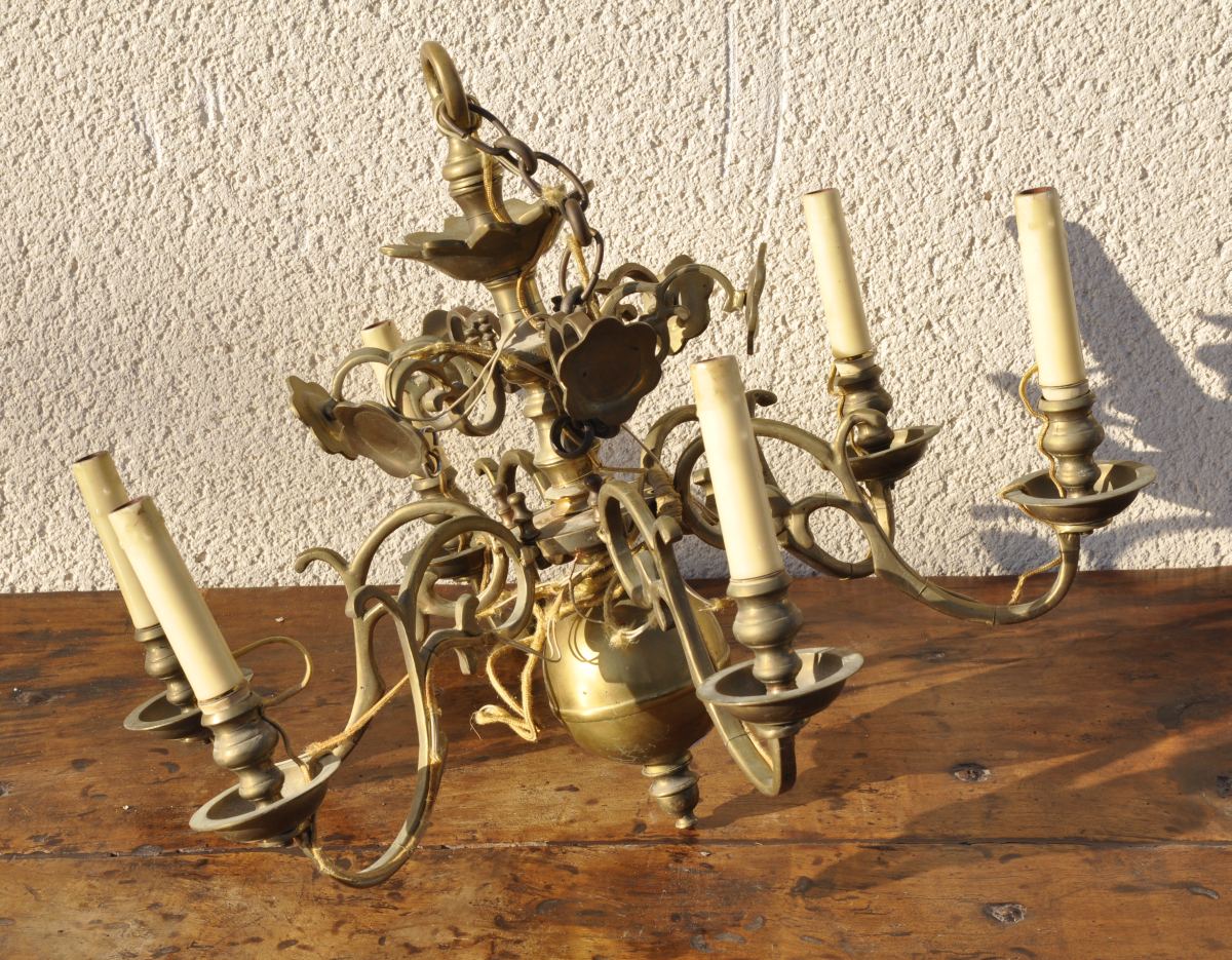 - LUSTRE à neuf bras de lumière de forme mouvementée sur deux registres: six sur le registre inférieur et trois sur le supérieur. Fût central tourné en balustre et terminé par une toupie.