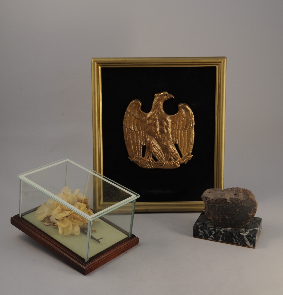 - FLEUR DE BOUGAINVILLIER présentée dans une petite vitrine de verre à socle de bois sous lequel un tapuscrit indique: "Ile de Sainte-Hélène / C'est à l'intention de Raymond Rose que ces fleurs ont été cueillies sur un arbre du wharf de Jamestown (chemin que suivit Napoléon après avoir débarqué du Northumberland le 15 octobre 1815) par un couple de Saint-Hélènois, le Dimanche 20 avril 1969.". - MORCEAU DE ROCHE présenté sur un socle de forme rectangulaire en marbre vert de mer sous lequel un tapuscrit indique: "Sainte-Hélène / Samedi, 19 Avril 1969 / Cette pierre provient du chemin d'accès au Tombeau de l'Empereur. Elle a été ramassée par Raymond Rose lors de la Croisière Impériale du Bi-Centenaire de la naissance de Napoléon, à 15 m. environ de celui-ci.
