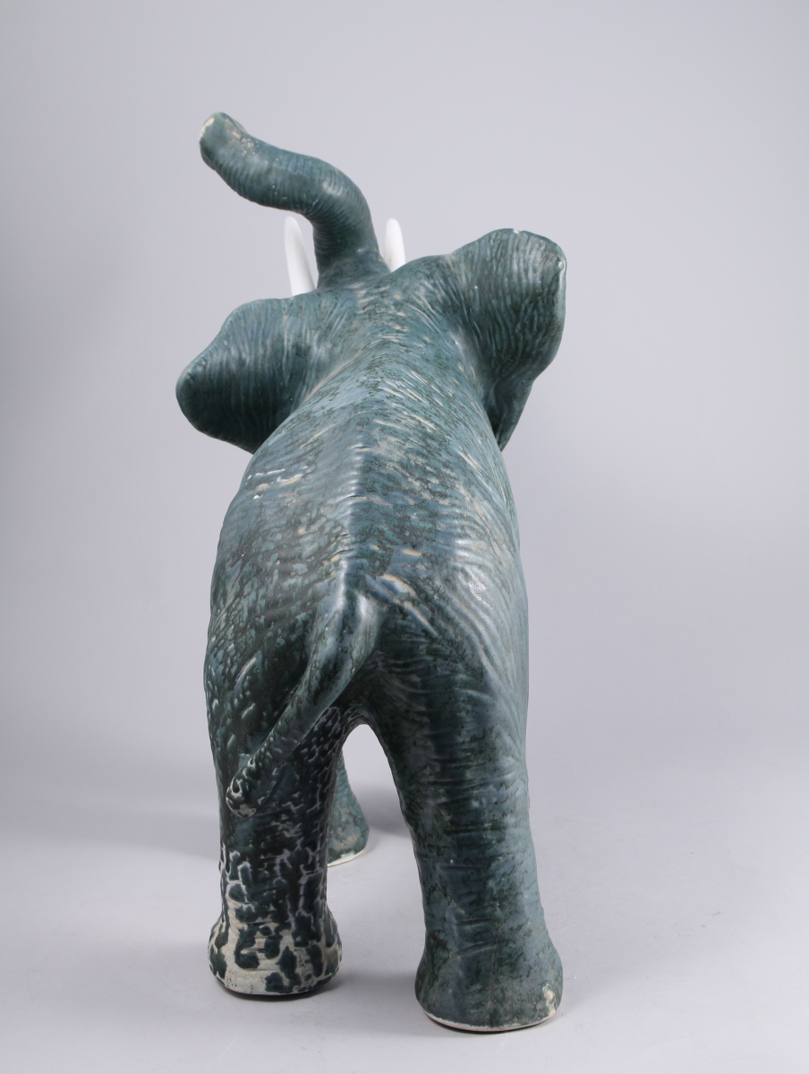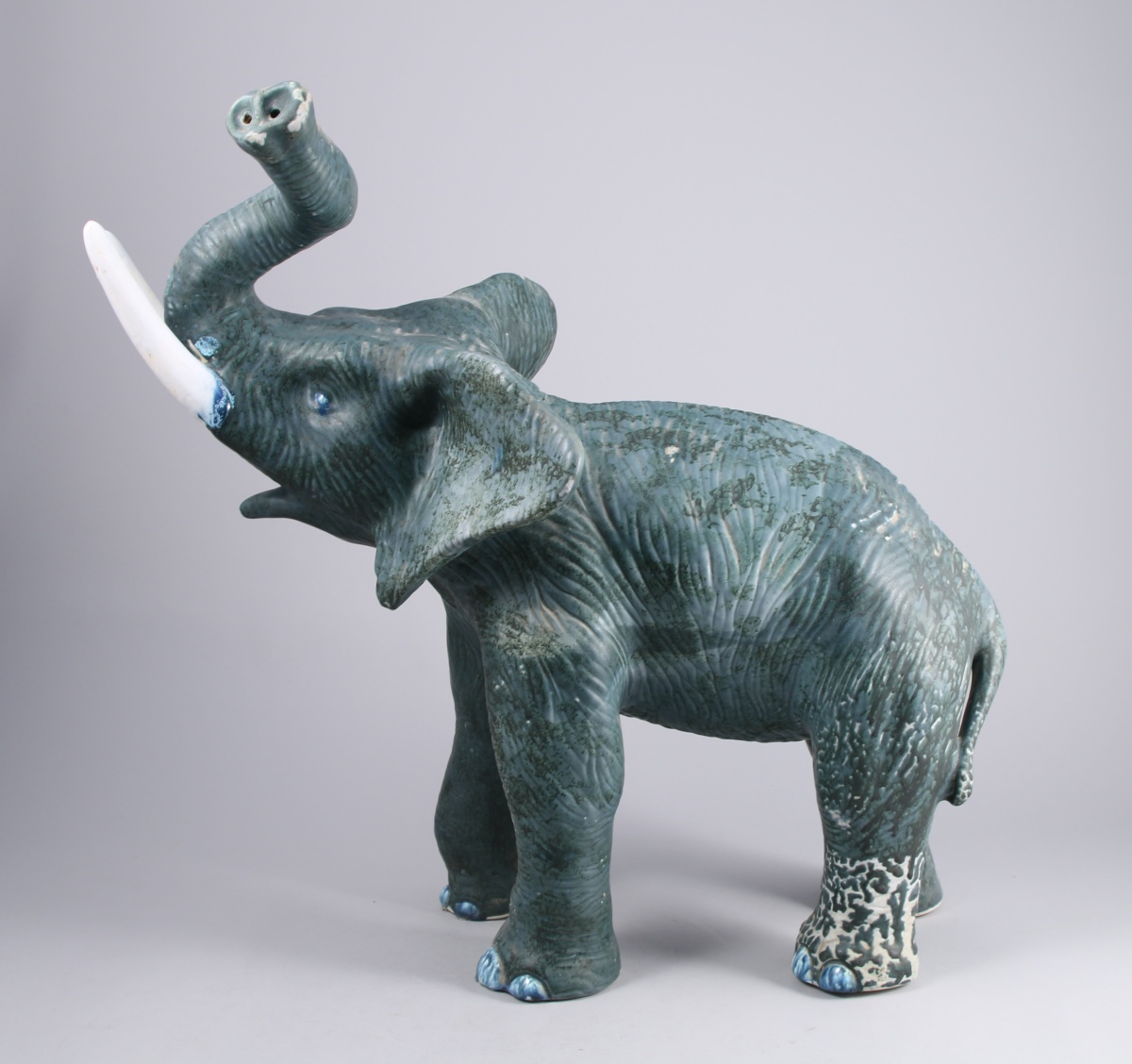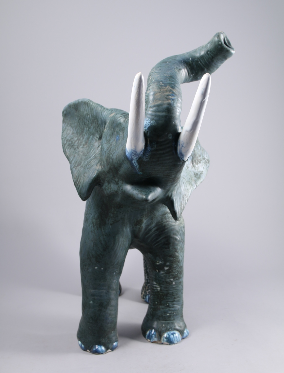 ÉLÉPHANT en faïence émaillée bleu, vert et blanc. Il lève légèrement sa pâte antérieure droite et sa trompe est en l'air. Rendu naturaliste du plissé de la peau de l'animal.
