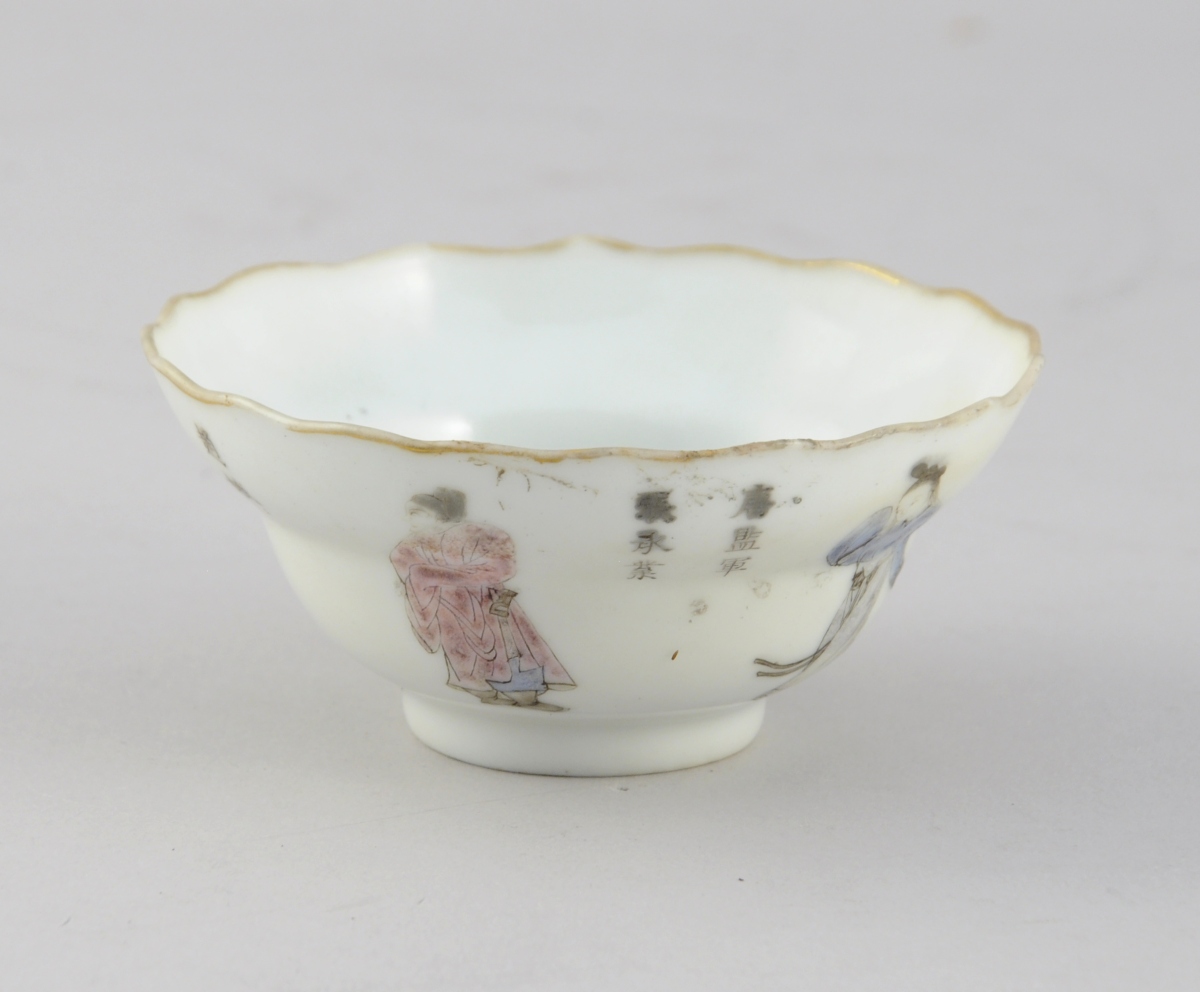 JOINT: Petit BOL en porcelaine à bords chantournés. Décor polychrome de personnages et idéogrammes. Filet or sur le col. Cachets. Haut. 4, Diam. 9,5 cm.