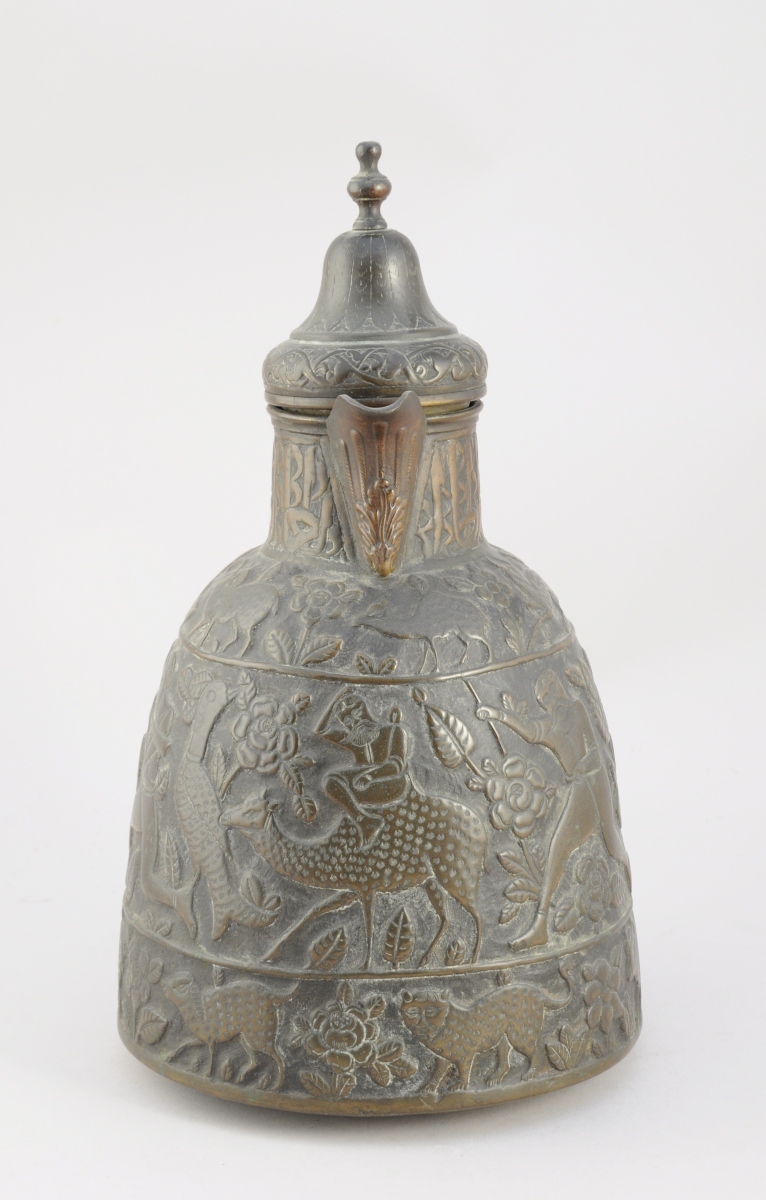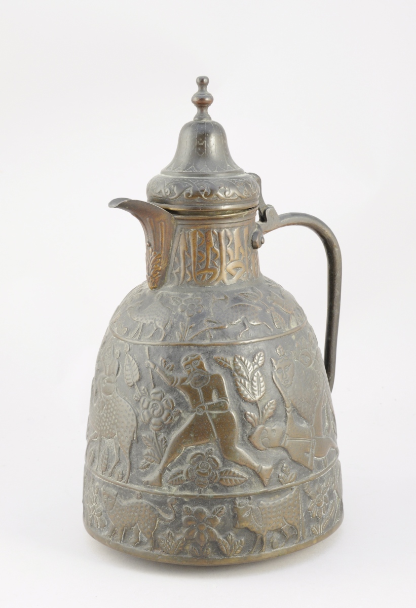 PROCHE-ORIENT. VERSEUSE CLOCHE en laiton repoussé d'une frise représentant une scène de chasse au lion et à dos de dromadaire entre deux bandeaux d'animaux. Le col avec des inscriptions calligraphiées.