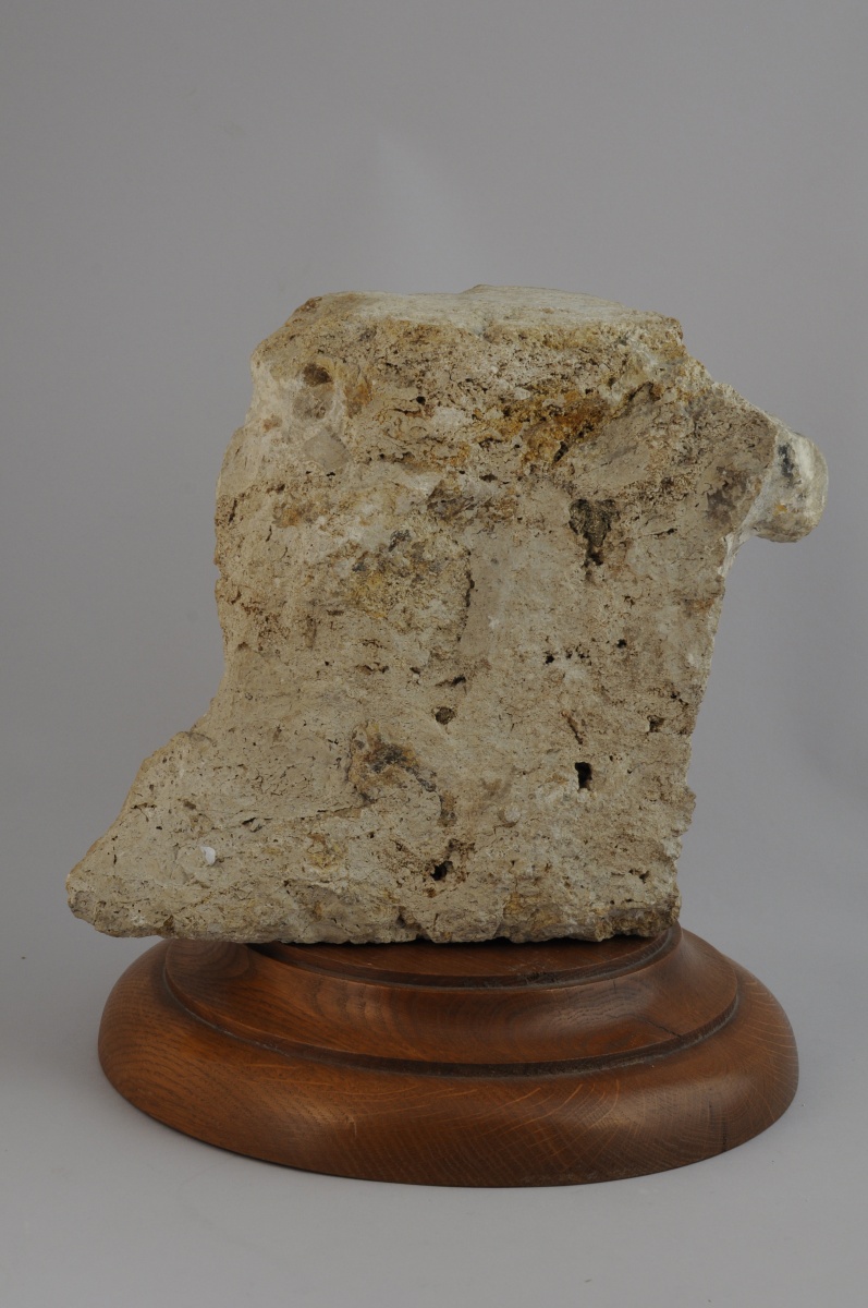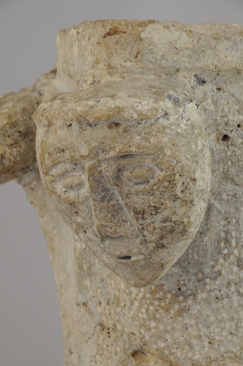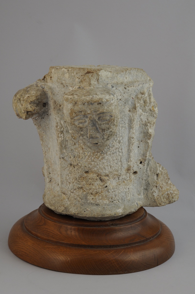 ÉLÉMENT D'ARCHITECTURE en pierre sculptée d'un personnage, traces de polychromie. Élément d'un fond baptismal ou d'une margelle?