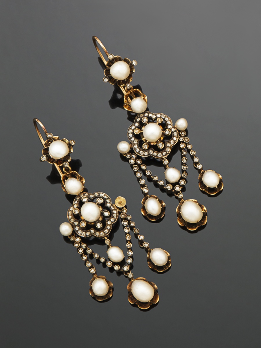 A yellow gold and silver pair of EARRINGS set with DIAMONDS and FINE PEARLS. 19th century.